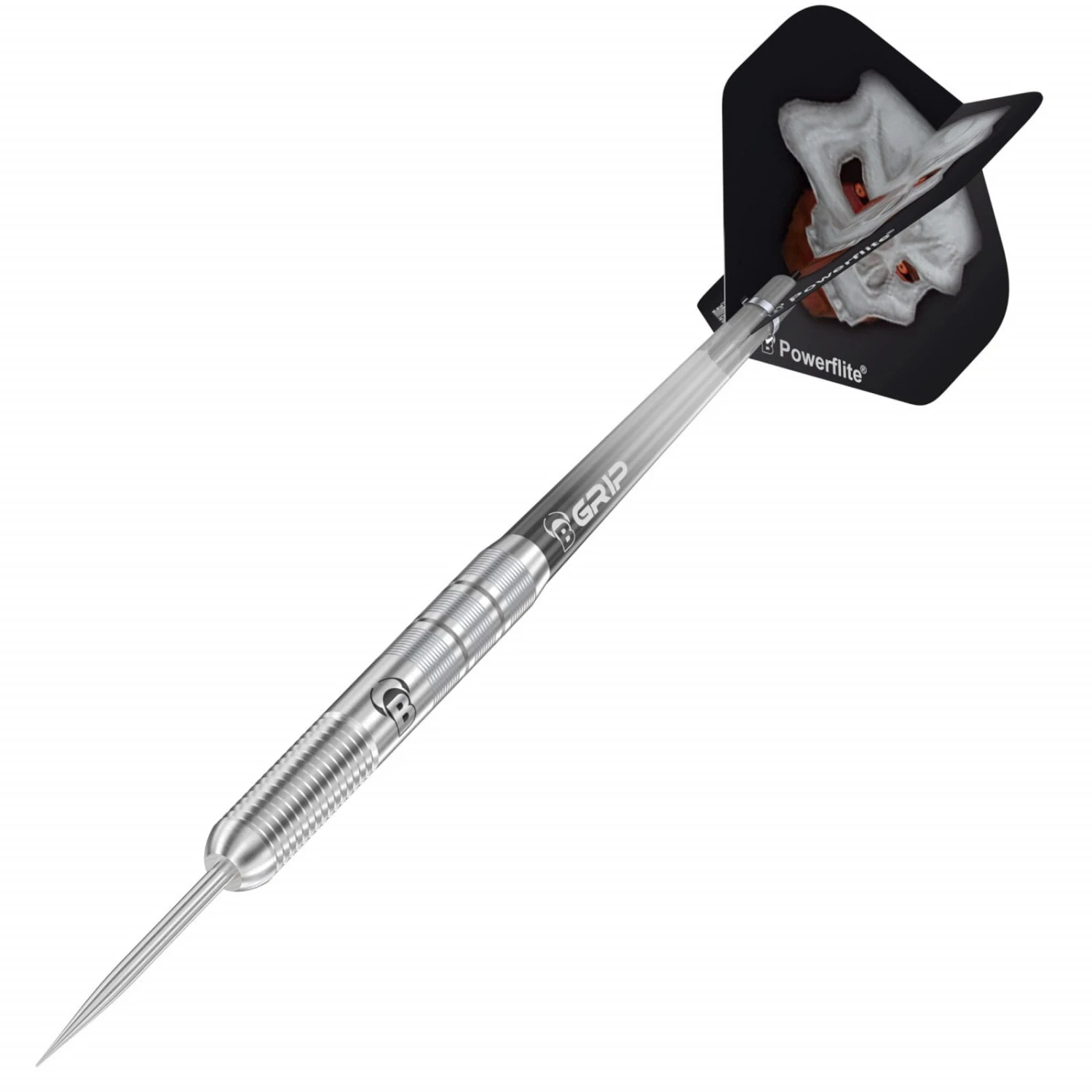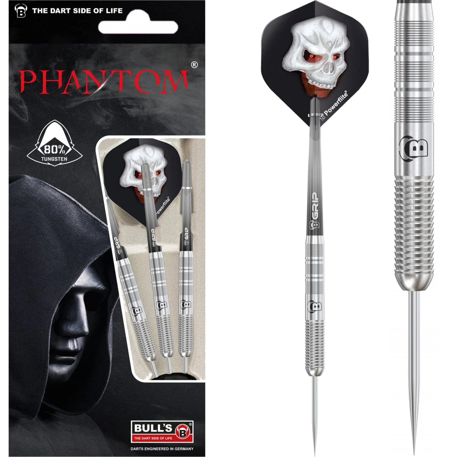 BULL’S Phantom PT1 Steel Tip Darts – Front Shark – 23g – D8930 – 80% Tungsten – Powerflite Flights – Nylon Shafts with Rings – Silver Dart Points. These 23 Darts feature a razor grip design at the front of the barrel, and 3 sections of a microgrip at the rear making the dart appeal to a wide audience. The Bulls Logo is lasered in the centre of the barrel.