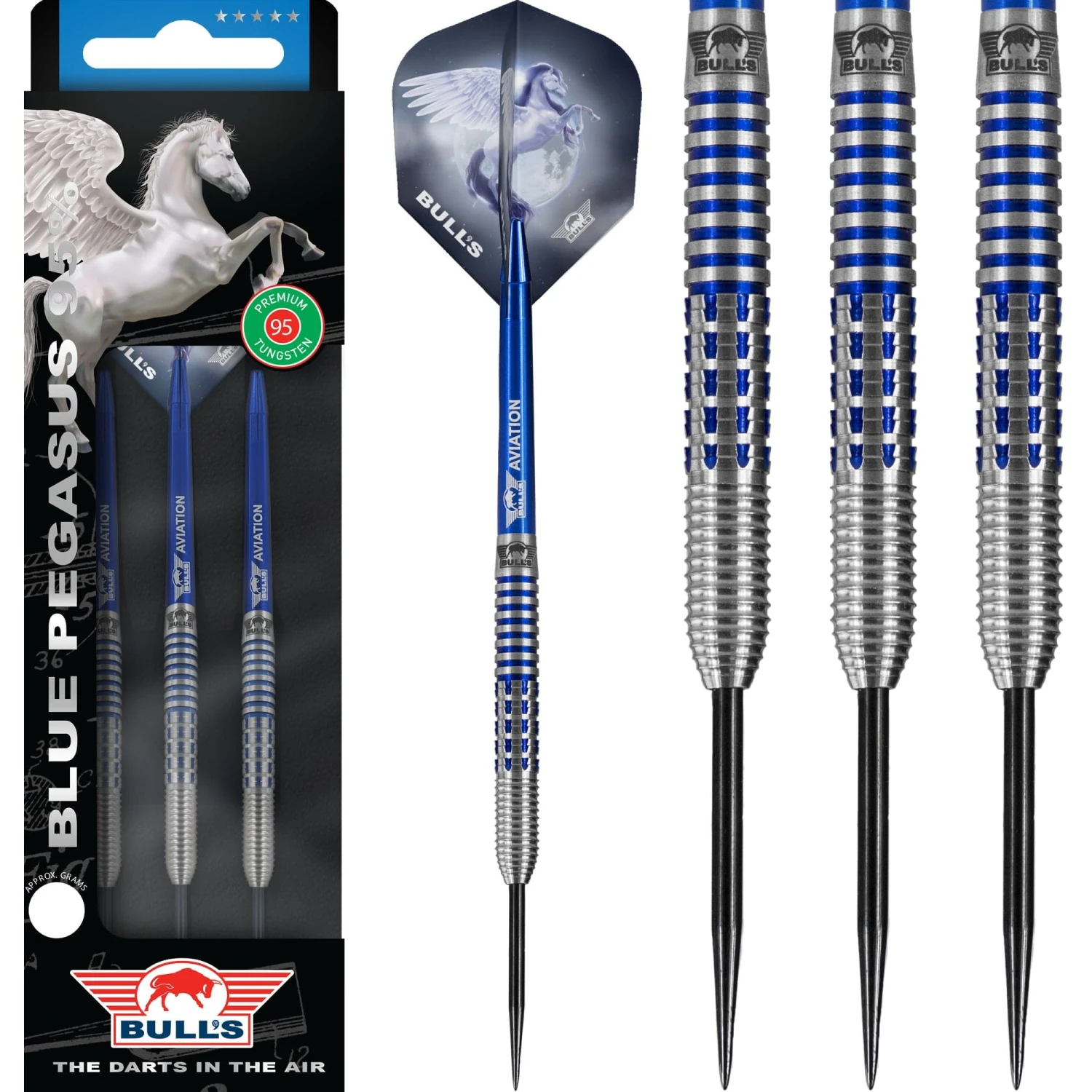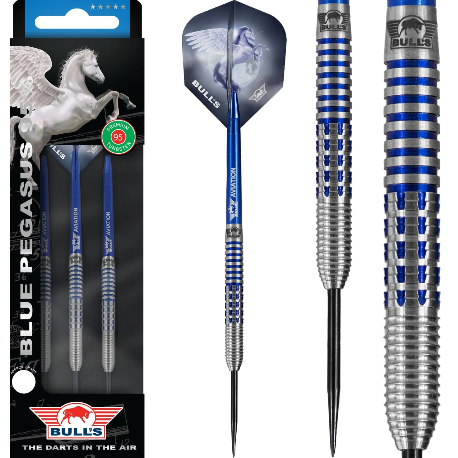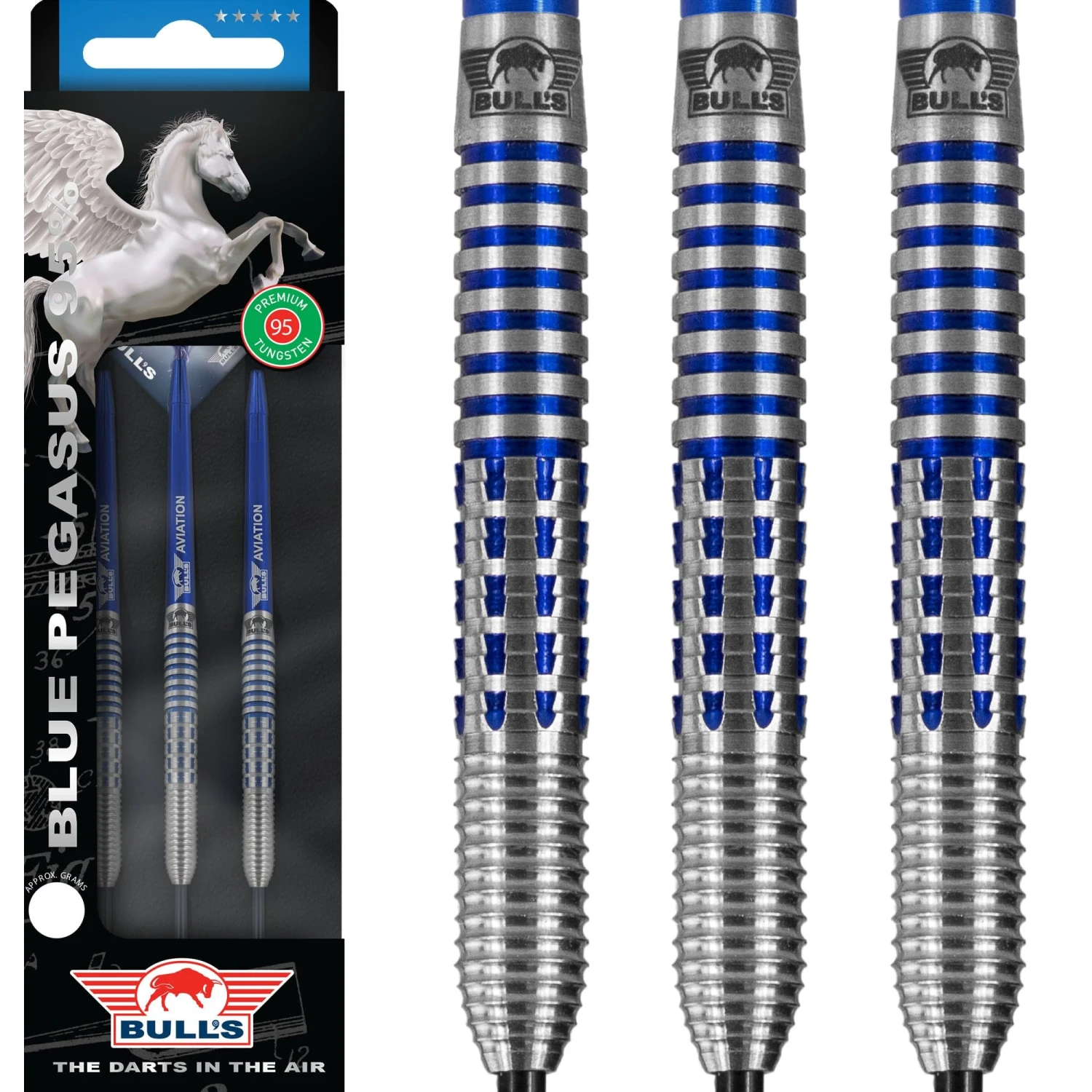 Bulls Blue Pegasus Darts – Steel Tip – 95% – Style A – 22g. Features 95% Tungsten Barrels, Bulls Shafts, Bulls Flights.