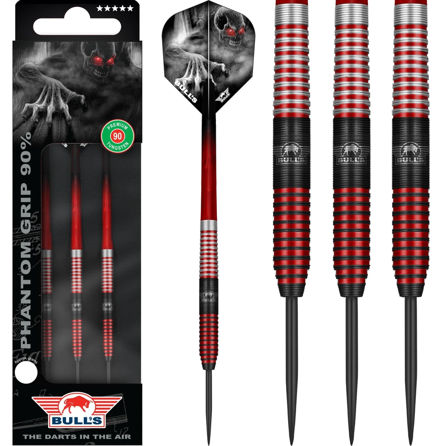 Bulls Phantom Grip 80% Tungsten Darts. Tungsten Steel Tip Dart, unicque micro grip rings for a perfect grip. Each pack contains Bulls Flash II Shafts, Bulls Powerflite Flights, and a Slim Case. Bulls Phantom Grip Darts – Steel Tip – Micro Ring Grip – Red