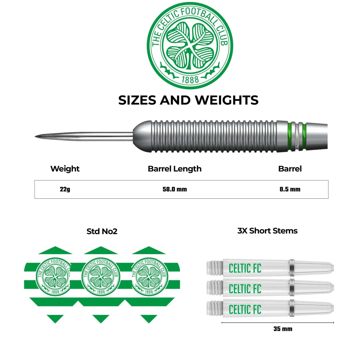 Celtic Football Club Darts – Steel Tip Brass – Official Licensed – Celtic 22g – Celtic Football Club Steel Tip Darts – The essential Darts for all Celtic Football Club die-hards! Beautiful darts featuring the instantly recognisable green and white accents on the Brass barrel as well as the famous Clover on the flights! Includes: Coated Brass Barrels, Celtic Flights, 1 Set of Nylon Shafts with rings, Point Protector, Bar Wallet. Celtic Football Club Darts – Steel Tip Brass – Official Licensed – Celtic – 22g