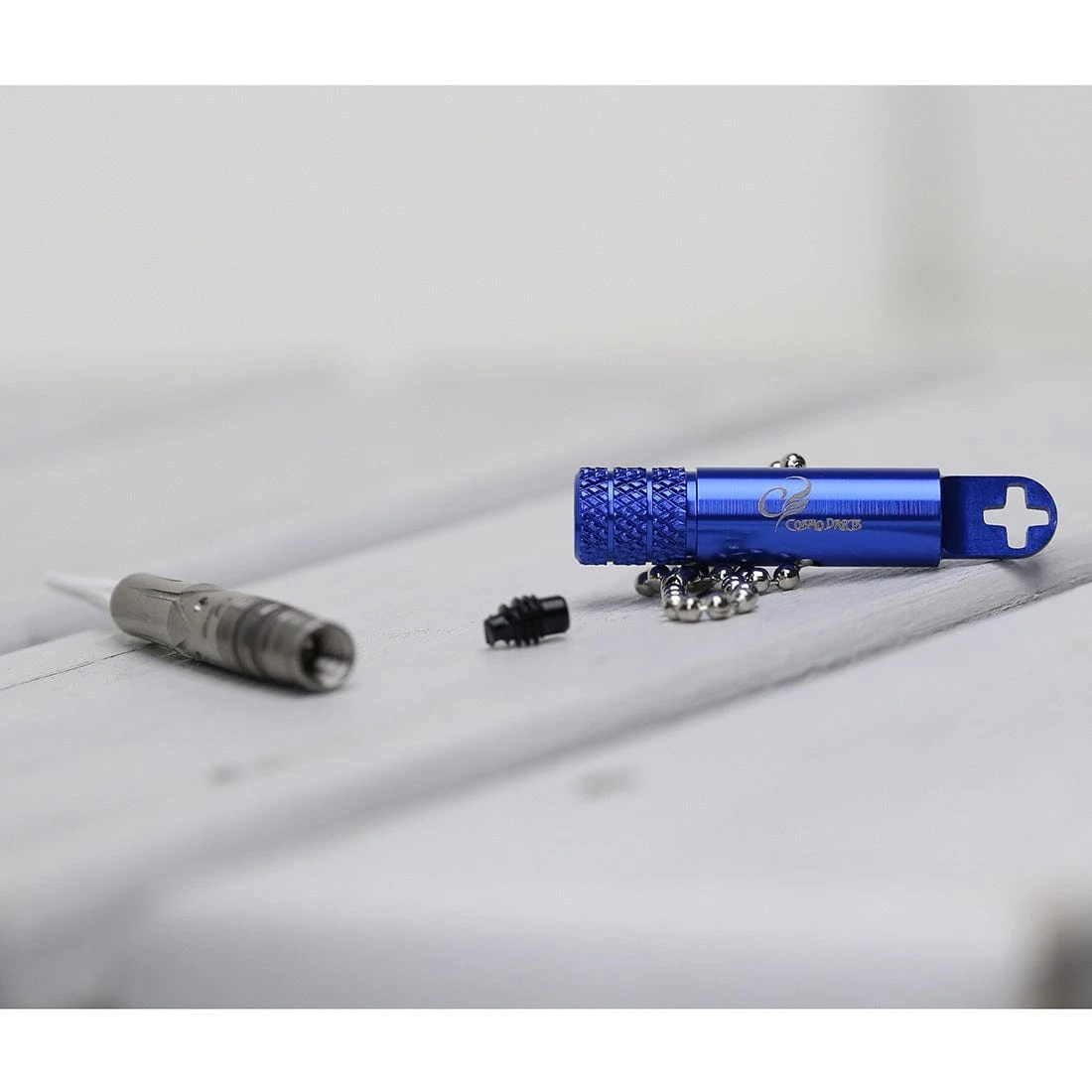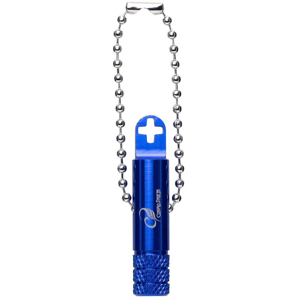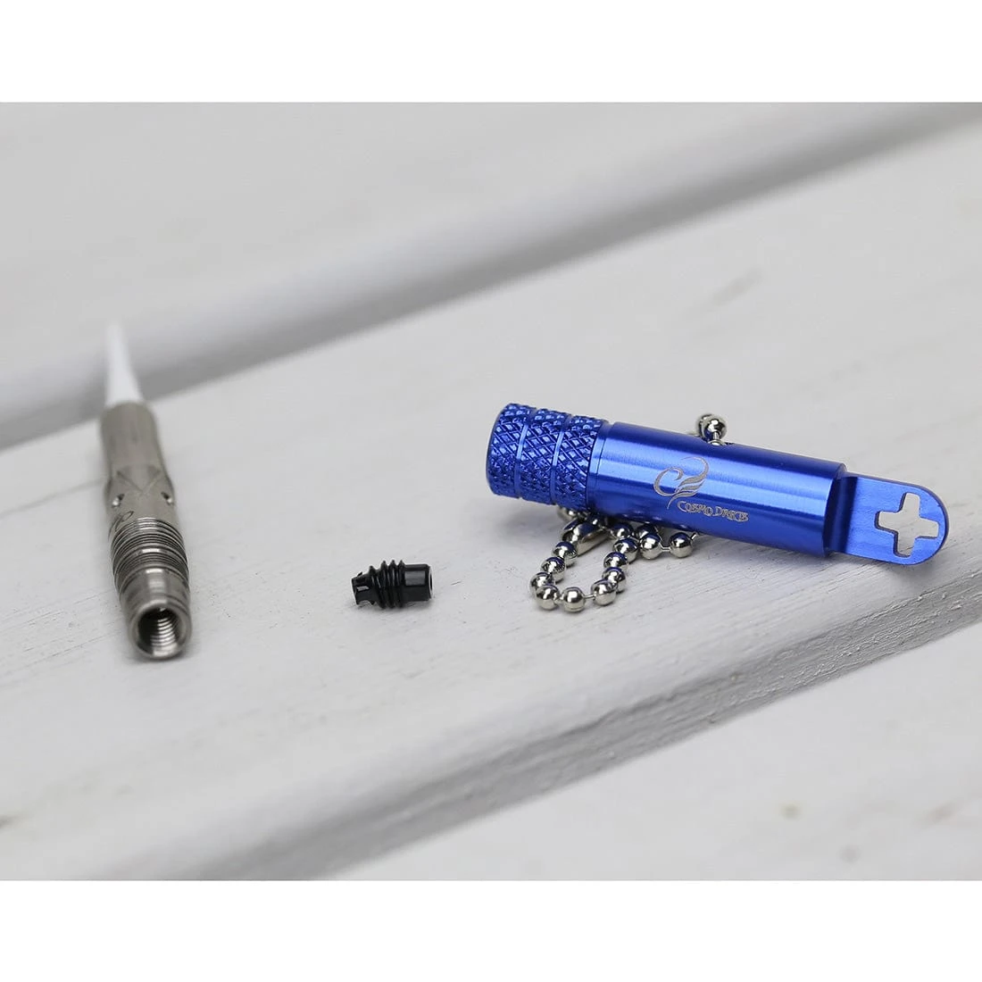 Cosmo Extractor Plus Tool – with Chain – Blue. Easily remove the broken points and shafts that get stuck in your darts. This tool easily grips the broken piece and turns to take it out. This unique tool also incorporates a plus design at the top, to help tighten the Cosmo Plus Soft Tip points into your soft tip darts.