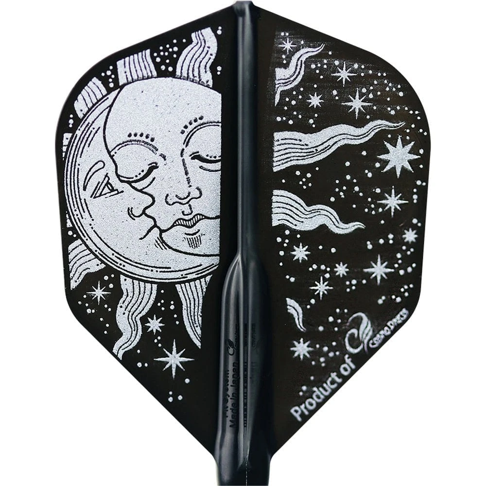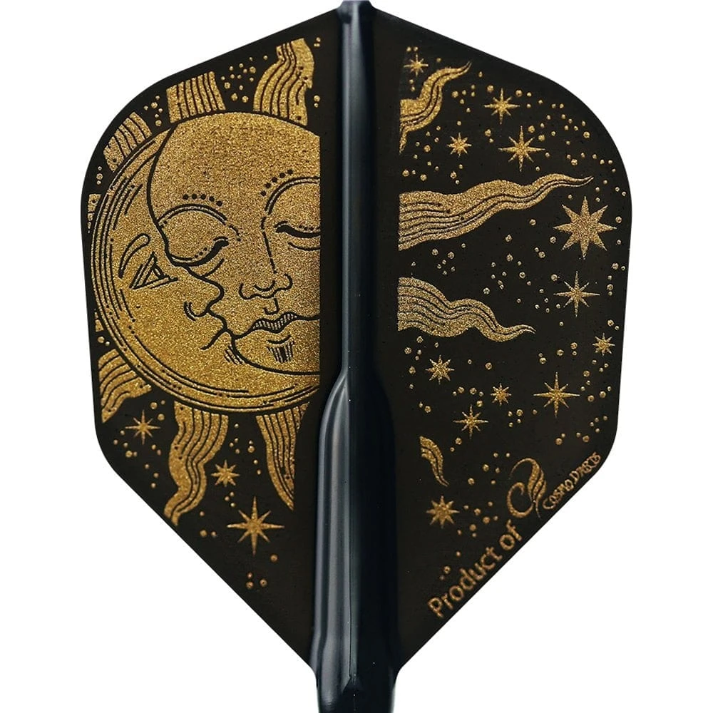 Cosmo Fit Flight AIR Moon and Sun Small Standard shape dart flights. The Fit Flight AIR is the most innovative Flight and Shaft System, and the AIR are 35% thinner than the standard Fit Flight. These small standard shape Moon and Sun flights have a moon/sun design in silver and gold on a black background. To be used with the Cosmo Fit Flight AIR Shafts.