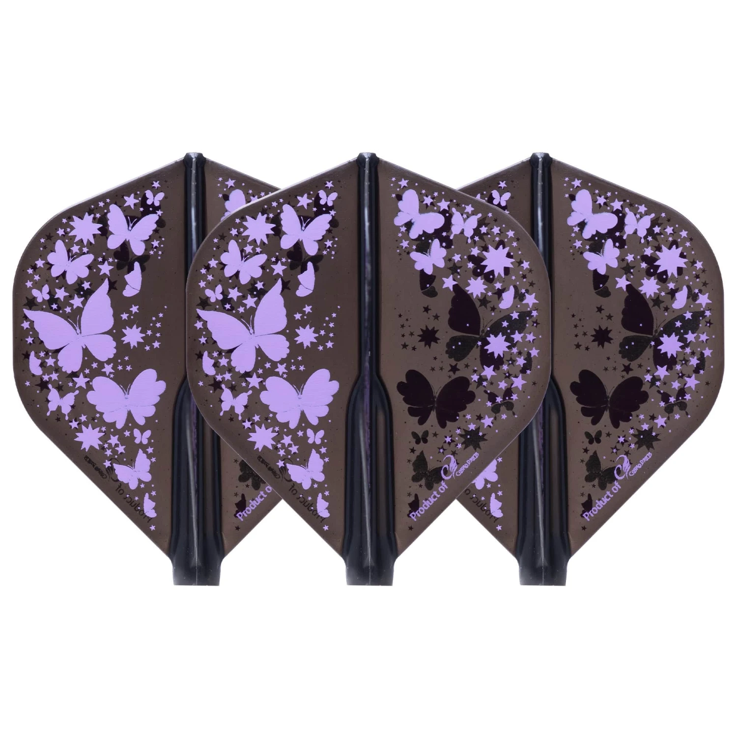 Cosmo Fit Flight – Standard – Black – Butterfly. These standard shape fit flight models feature a purple butterfly design on a black base. The AIR model is 30% thinner than the standard version. The flights are to be used with any Cosmo Fit Shaft. Each pack contains 3 flights.