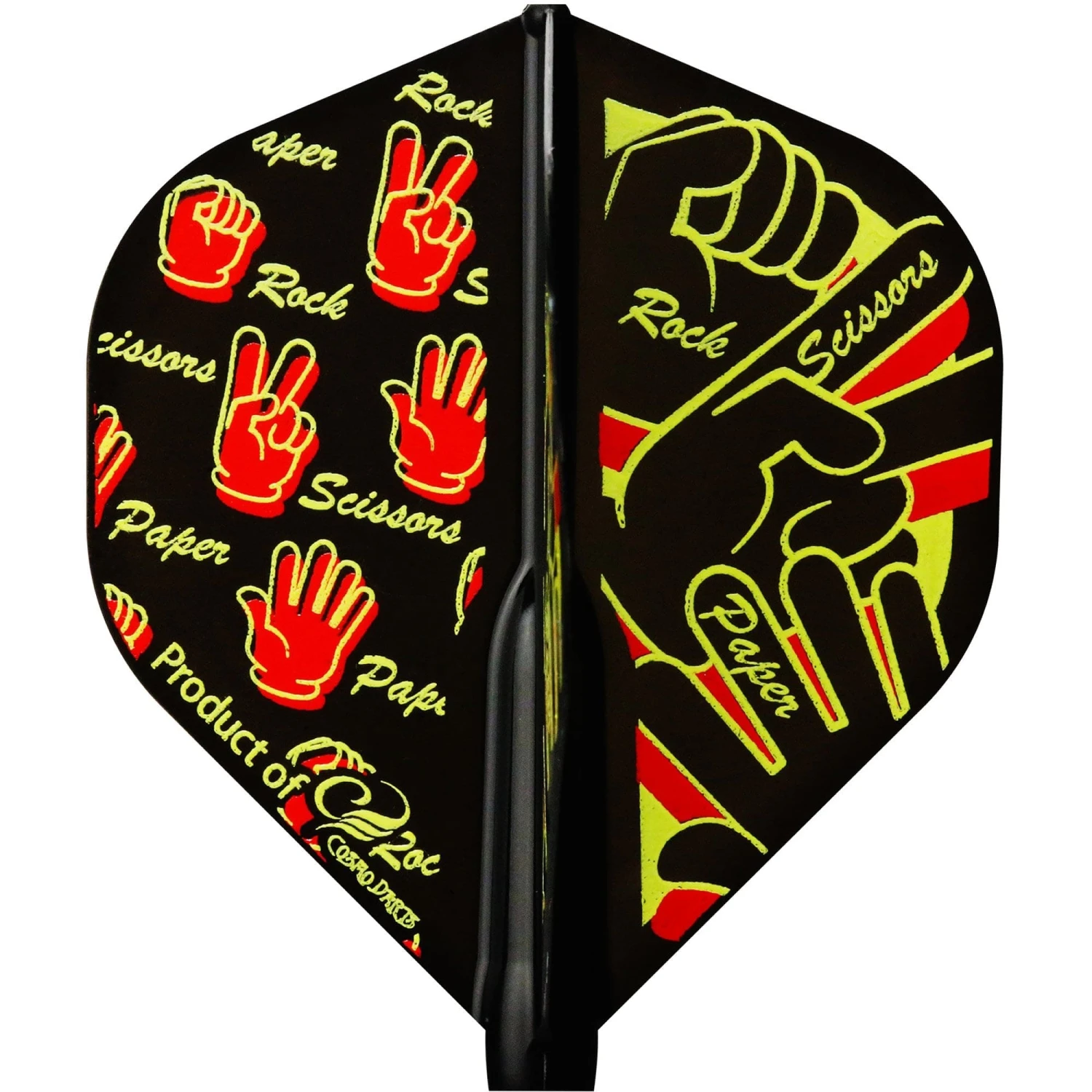 Cosmo Fit Flight AIR Janken Standard shape dart flights. The Fit Flight AIR is the most innovative Flight and Shaft System, and the AIR are 35% thinner than the standard Fit Flight. These standard shape Janken flights have a Rock, Paper, Scissors design on a black background. To be used with the Cosmo Fit Flight AIR Shafts.