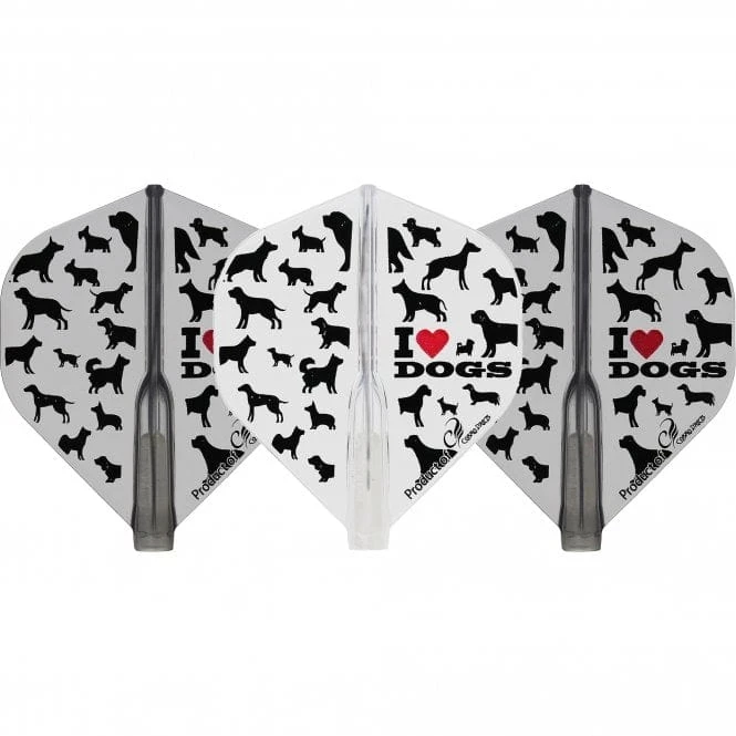 Cosmo Fit Flight AIR I Love Dogs Standard shape dart flights. The Fit Flight AIR is the most innovative Flight and Shaft System, and the AIR are 35% thinner than the standard Fit Flight. These standard shape I Love Dogs flights have a dog silhouette design on a mixed black and white background. To be used with the Cosmo Fit Flight AIR Shafts.