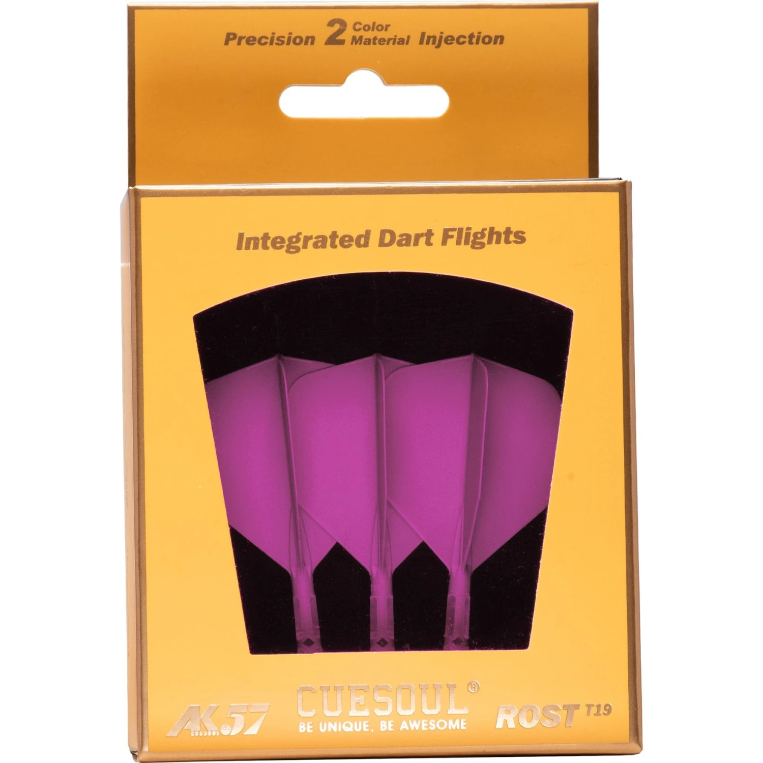 Cuesoul Rost T19 Integrated clear dart shaft and big wing pink flights. This fully moulded system screws into the barrel, just as with a standard stem. The pink moulded flight features a reinforcing rib to help prevent Robin Hooding. The medium clear dart shaft is measured for what is visible once the dart is assembled. Shaft length: 28mm