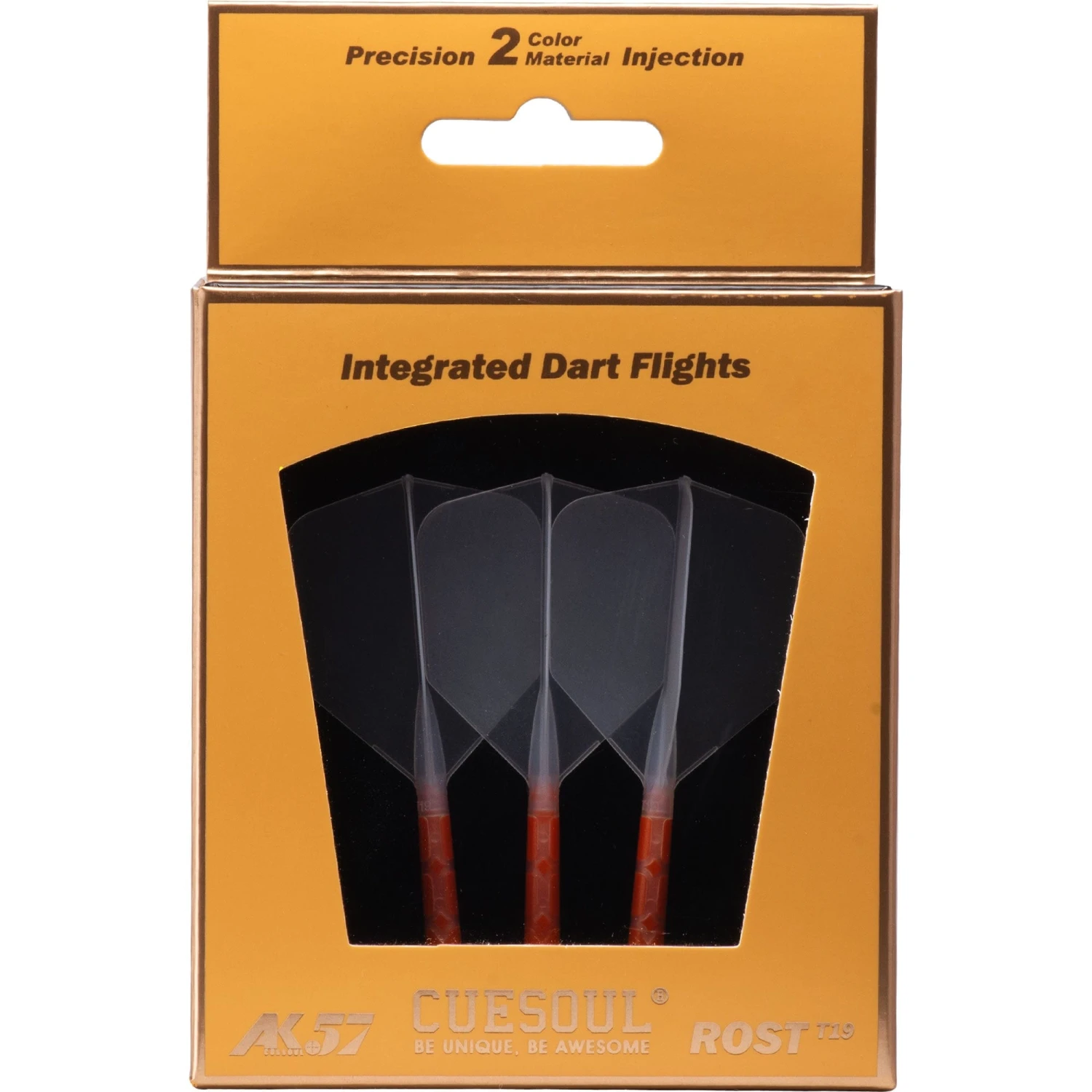 Cuesoul Rost T19 Integrated orange dart shaft and big wing clear flights. This fully moulded system screws into the barrel, just as with a standard stem. The clear moulded flight features a reinforcing rib to help prevent Robin Hooding. The medium orange dart shaft is measured for what is visible once the dart is assembled. Shaft length: 28mm