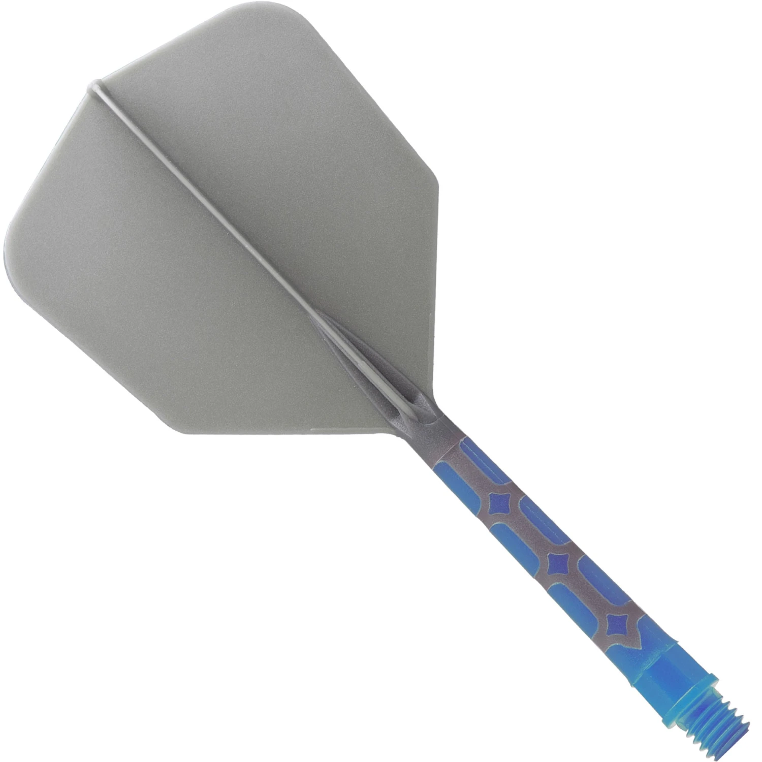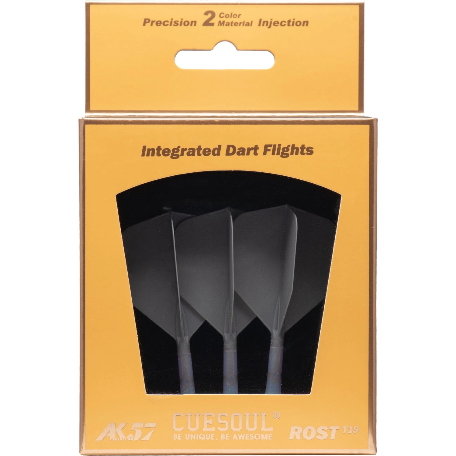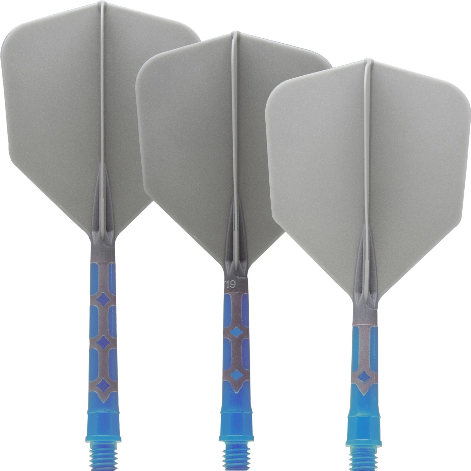 Cuesoul Rost T19 Integrated sky blue dart shaft and big wing grey flights. This fully moulded system screws into the barrel, just as with a standard stem. The grey moulded flight features a reinforcing rib to help prevent Robin Hooding. The long sky blue dart shaft is measured for what is visible once the dart is assembled. Shaft length: 33mm