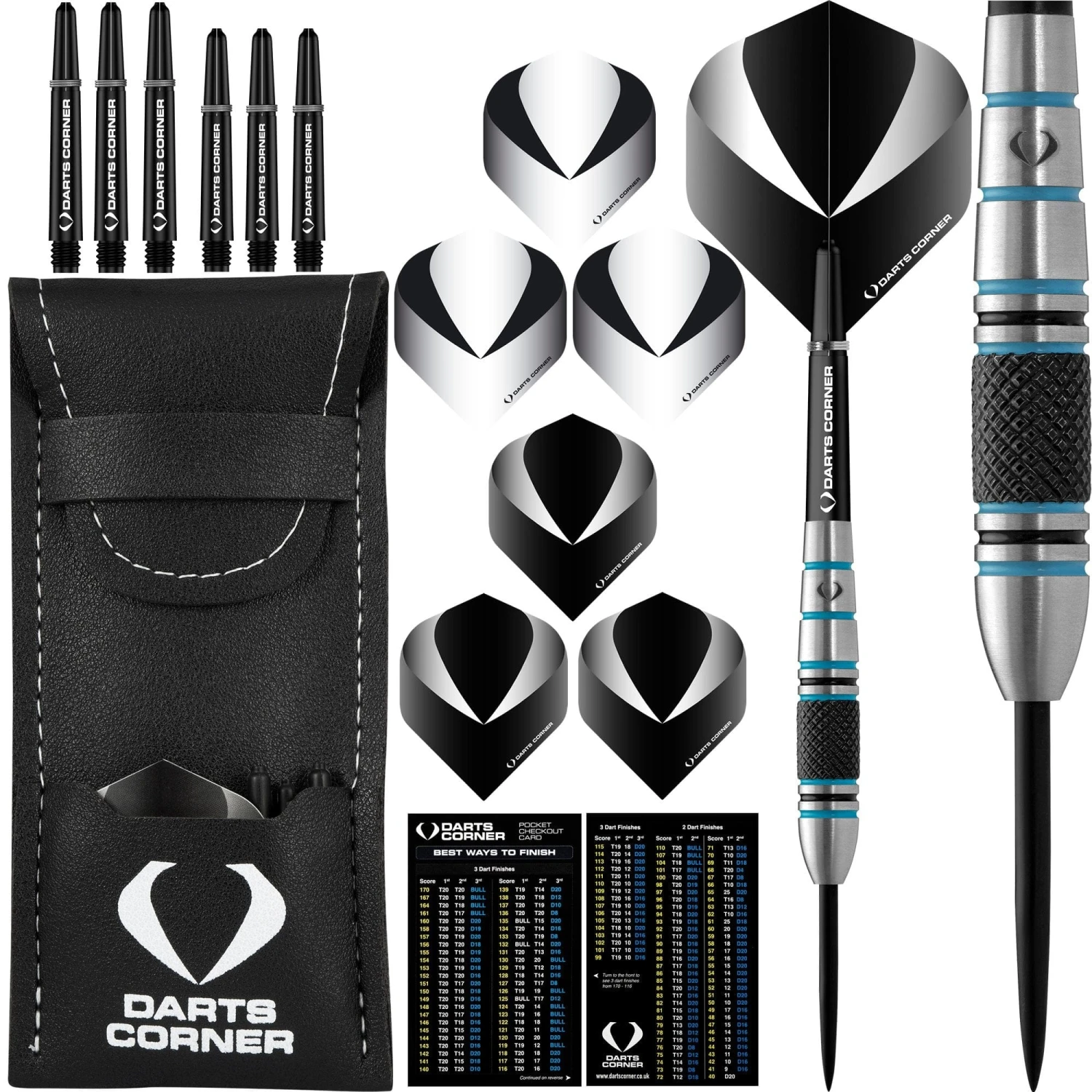 Darts Corner Marine 80% Steel Tip Darts – M1 Aqua Black. Quality 80% Tungsten Darts. Includes: 2 Sets of Darts Corner Flights, 2 Set of Nylon Shafts with springs, Point Protector, Darts Corner Bar Wallet, Checkout Card. Darts Corner Marine Darts – Steel Tip – M5 – Aqua Black – 25g-D0683