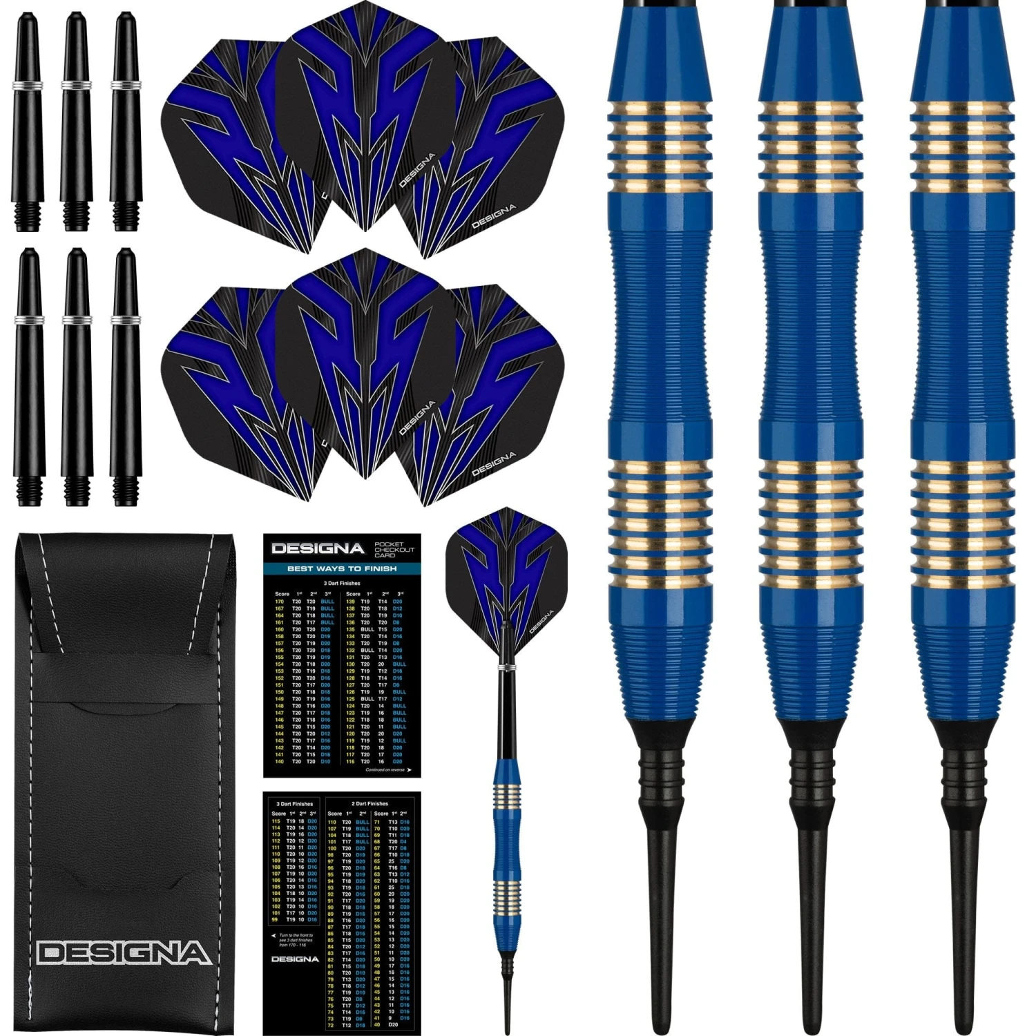 Designa Mako Soft Tip Electro Brass Darts. Quality Brass Soft Tip Darts. Includes: 2 Sets of Designa Flights, 1 Set of Nylon Shafts with rings, Point Protector. Designa Mako Darts – Soft Tip Electro Brass – Micro Grip – Blue