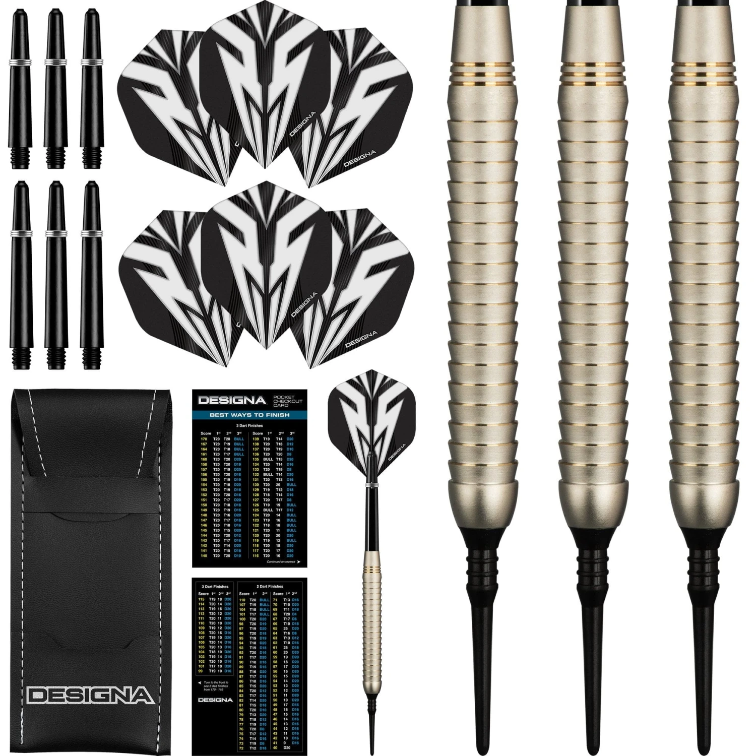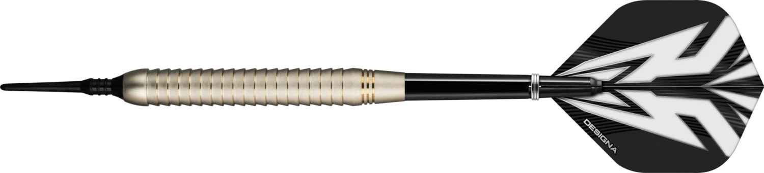 Designa Mako Soft Tip Electro Brass Darts. Quality Brass Soft Tip Darts. Includes: 2 Sets of Designa Flights, 1 Set of Nylon Shafts with rings, Point Protector.