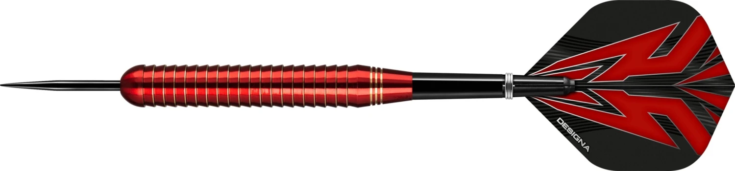 Designa Mako Steel Tip Electro Brass Darts. Quality Brass Steel Tip Darts. Includes: 2 Sets of Designa Flights, 1 Set of Nylon Shafts with rings, Point Protector. Designa Mako Darts – Steel Tip Electro Brass – Shark Grip – Red