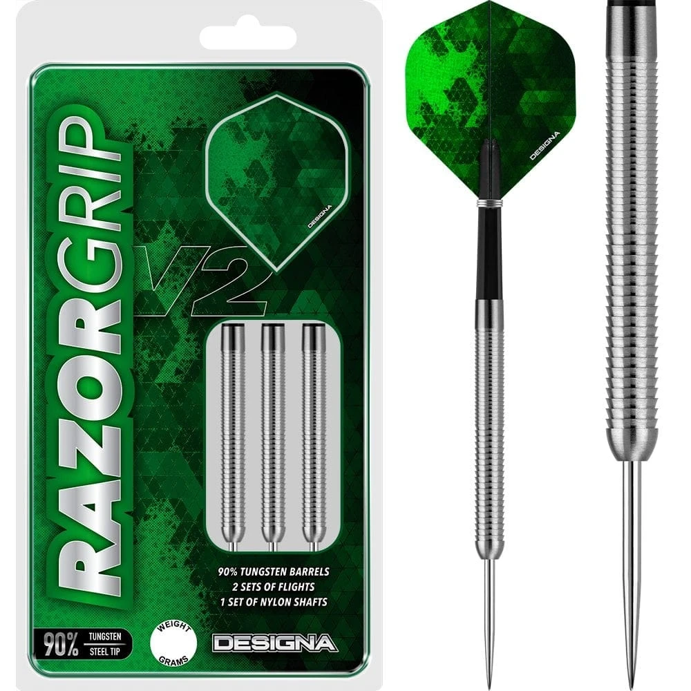 Designa Razor Grip V2 Darts – 90% Steel Tip Tungsten Darts. Features: 90% Tungsten Barrels, 2 Sets of Designa Flights, 1 set of Nylon Shafts, Point Protector.