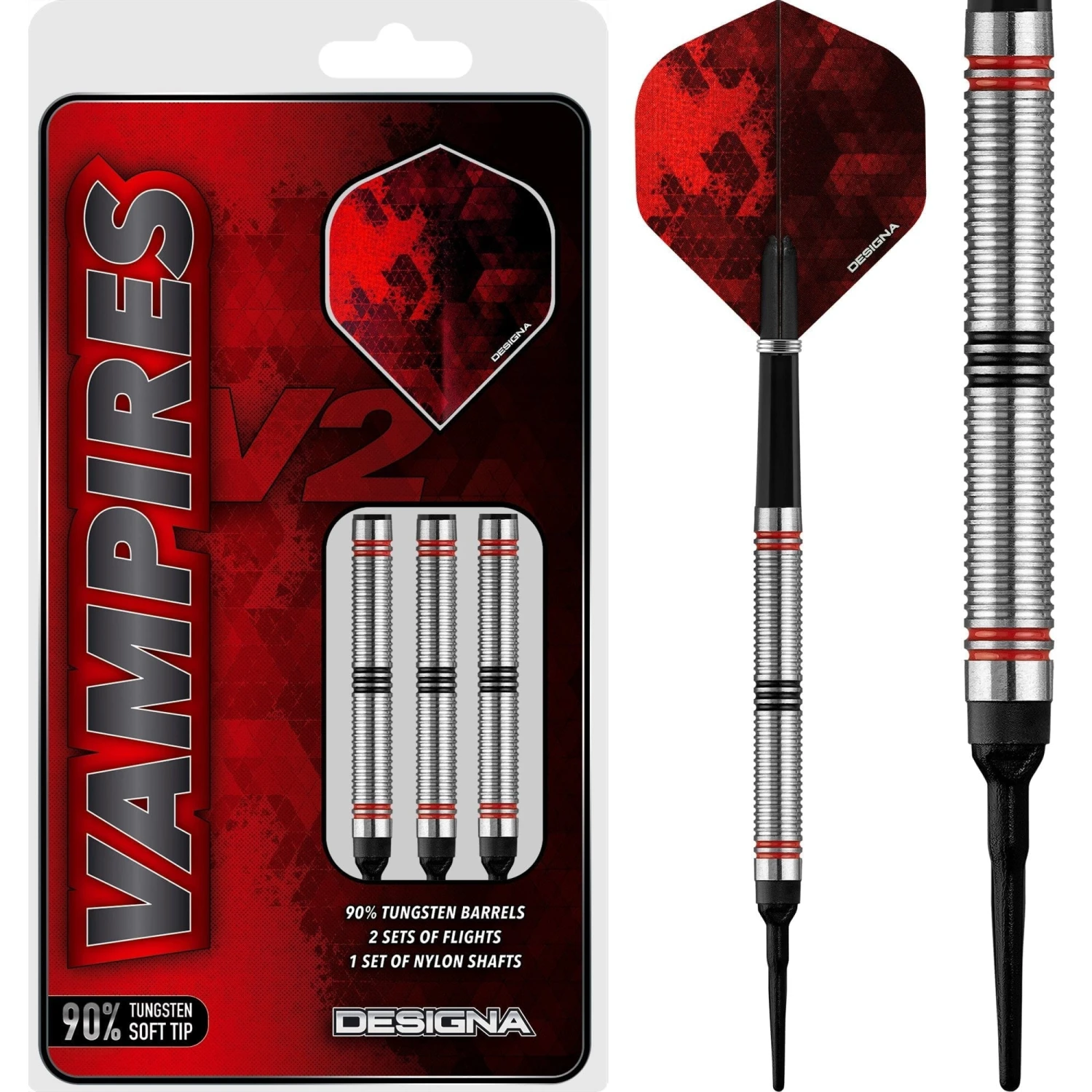 Designa Vampires V2 Soft Tip Darts – 90% Tungsten. Quality 90% Tungsten Darts. Includes: 2 Sets of Designa Flights, 1 Set of Nylon Shafts with rings, Point Protector. Designa Vampires V2 Darts – Soft Tip – M4