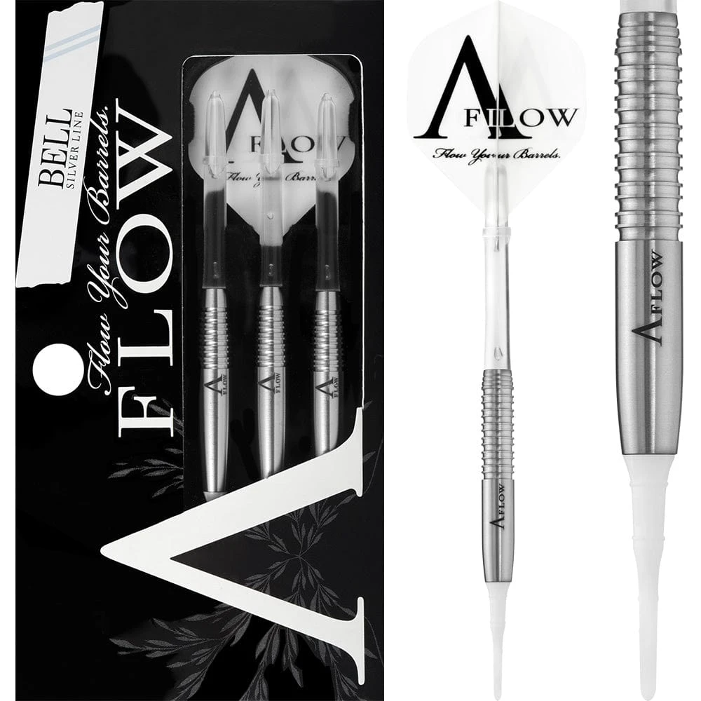 Dynasty Silver Line A Flow Soft Tip Tungsten Darts – Bell. Features: 80% Tungsten Barrels, Dynasty Flights and Shafts. Flights and Shafts may vary from picture.