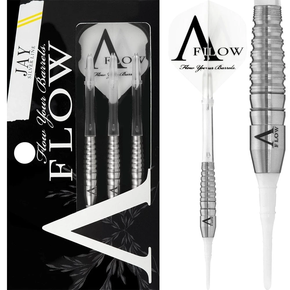 Dynasty Silver Line A Flow Soft Tip Tungsten Darts – Jay. Features: 80% Tungsten Barrels, Dynasty Flights and Shafts. Flights and Shafts may vary from picture.