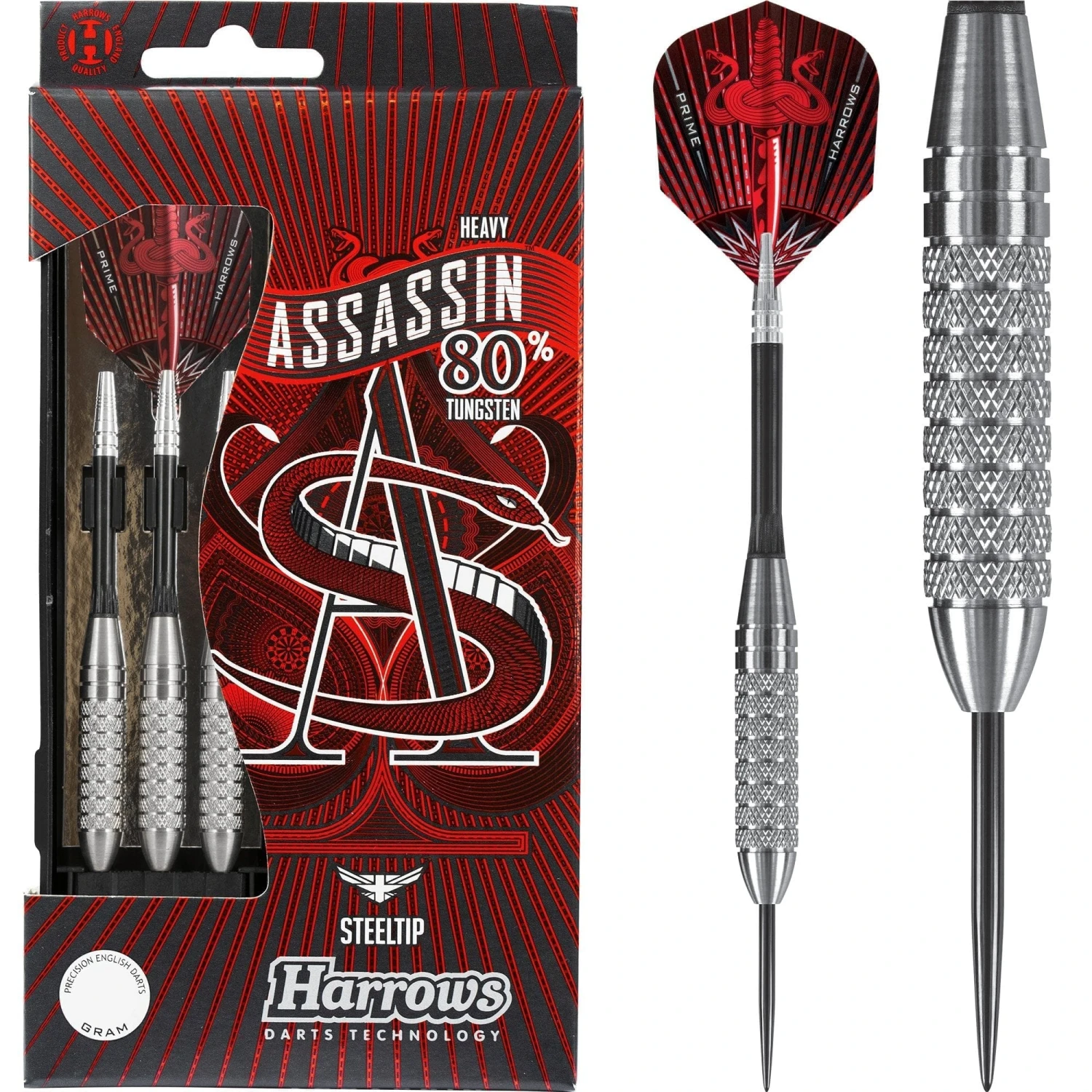 Harrows Assassin 80% Steel Tip Tungsten Heavy Darts. The Assassin 80% Heavy range offers a fully comprehensive selection of styles and weights, which combine to form a series of radical and highly popular patterns. Features: Tungsten Barrels, Alamo shafts, Assassin flights, Slimline Case.