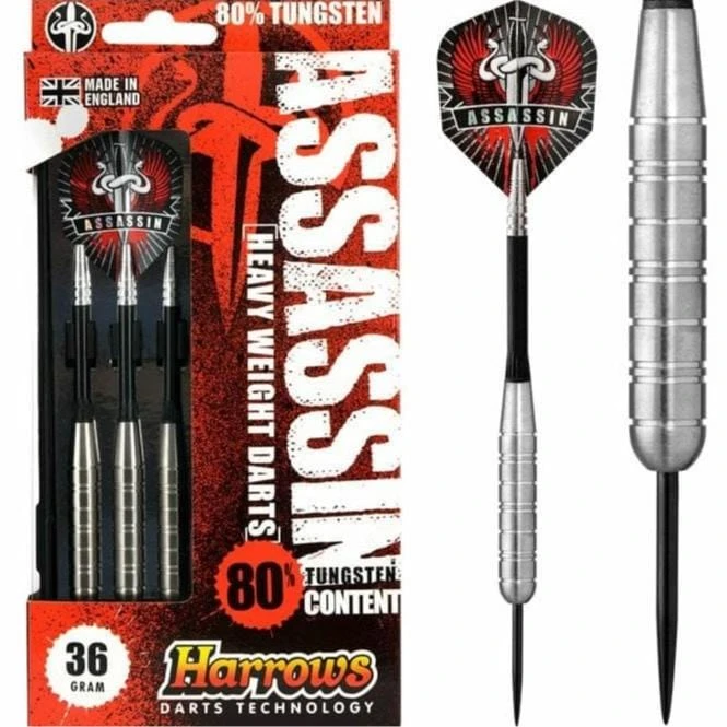 Harrows Assassin 80% Steel Tip Tungsten Heavy Darts. The Assassin 80% Heavy range offers a fully comprehensive selection of styles and weights, which combine to form a series of radical and highly popular patterns. Features: Tungsten Barrels, Alamo shafts, Assassin flights, Slimline Case.
