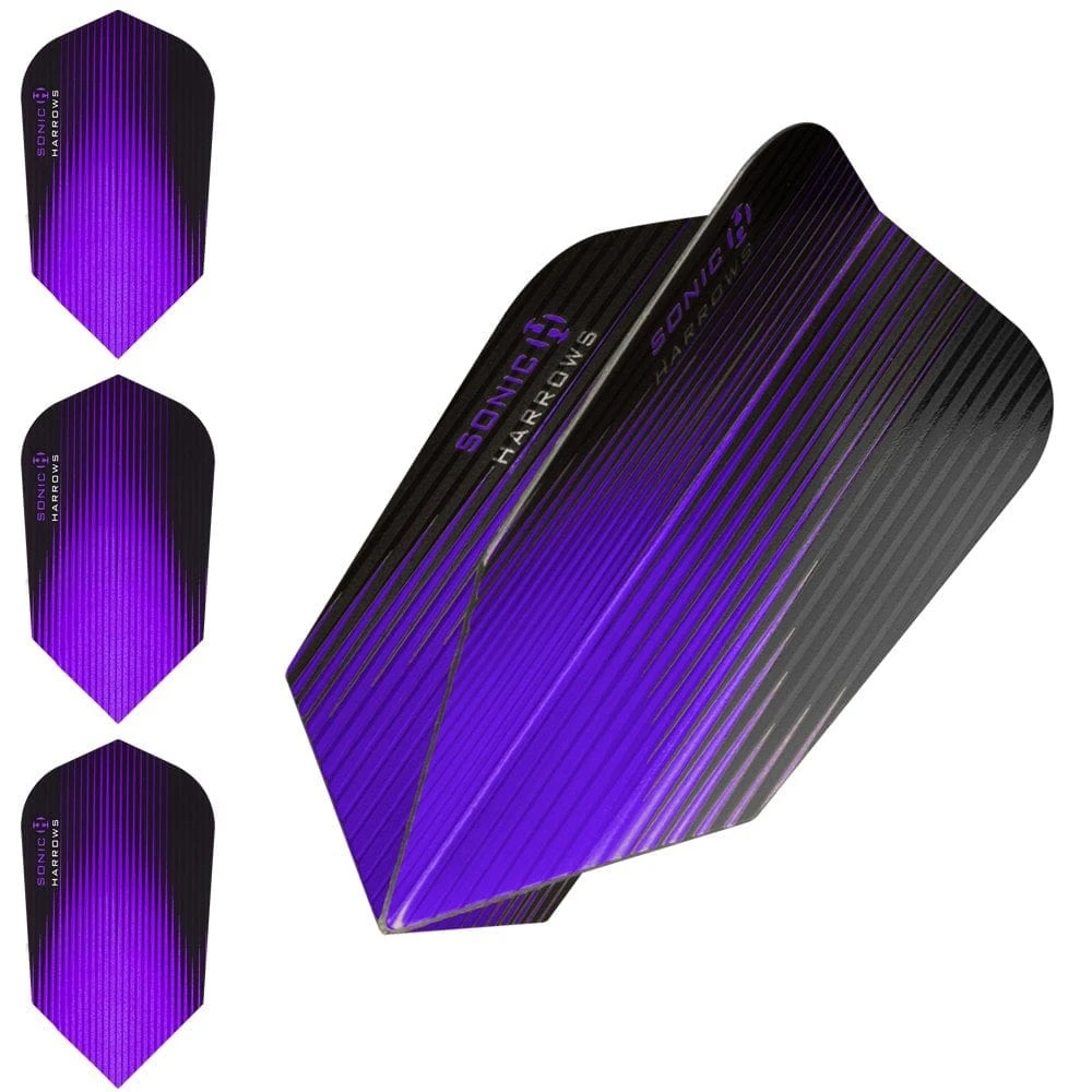 Harrows Sonic 100 Micron Extra Strong Dart Flights. Produced using a 100 micron, metallic laminate coupled with state of the art print techniques, to offer a tough but contemporary product. Harrows Sonic Dart Flights – Slim Shape – 100 Micron This bag contains approximately 100 sets of loose flights (300 individual flights).
