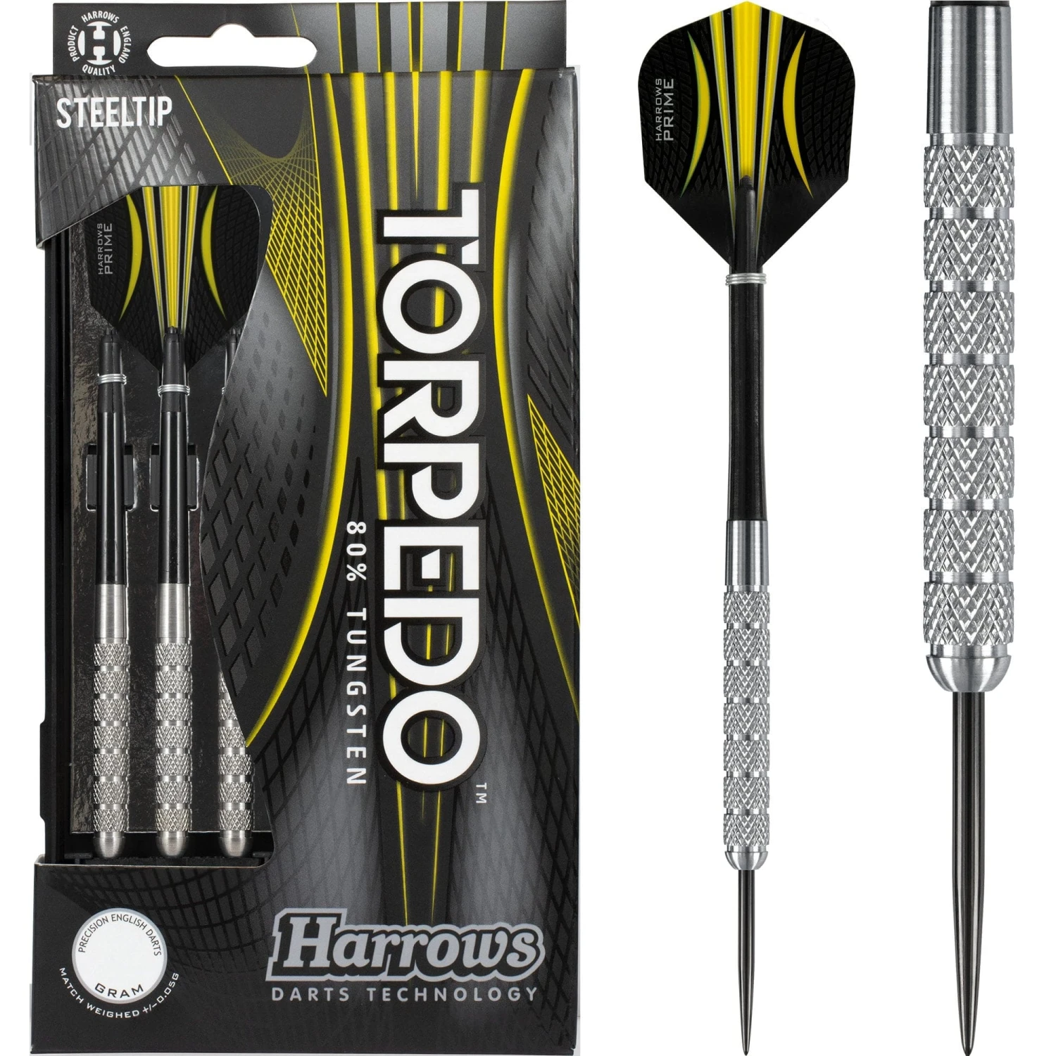 Harrows Torpedo Darts – 80% Tungsten Darts. Torpedo tungstens feature parrallel barrels. Nylon shafts with flight retaining ring grips are teamed with patented Dimplex flights, creating an intermediate priced series for the developing player.