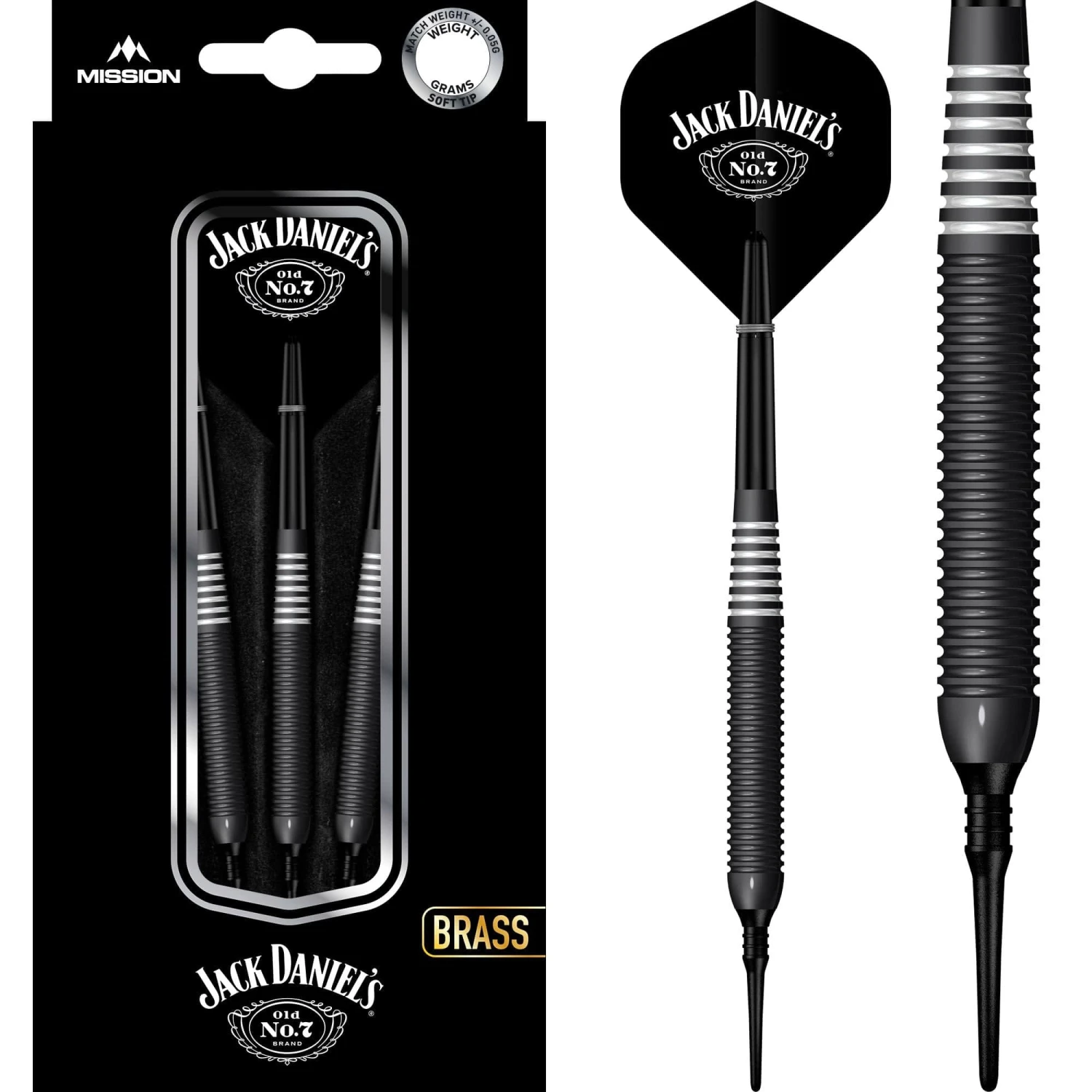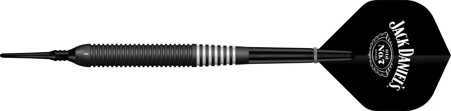 Jack Daniels Old No7 Electro Black Soft Tip Brass Darts. Features: Brass Barrels with Electro Black Coating and White Rings, 1 Set of Jack Daniels Flights, 1 Set of Shafts with Springs, Point Protector. Jack Daniels Old No7 – Electro Black Brass Darts – Soft Tip – 19g-D9703