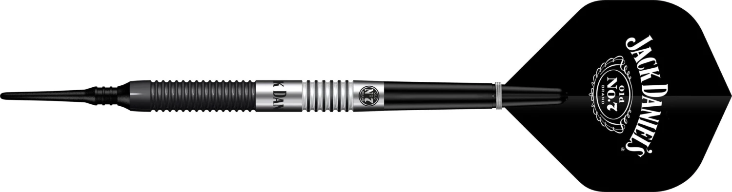 Jack Daniels Old No7 90% Soft Tip Tungsten Darts. Features: 90% Black Titanium Tungsten Barrels with White Rings, 1 Set of Jack Daniels Flights, 1 Set of Shafts with Springs, Point Protector. Jack Daniels Old No7 – Tungsten Darts – Soft Tip – Black – 20g-D9879