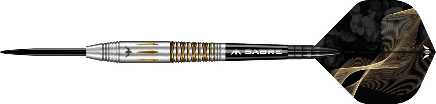 Mission Almudena Fajardo Ayuso -Steel Tip – 95% Tungsten – Gold PVD Milled Silver – 23g. Grow your own reputation in the game with these Almudena Fajardo Darts. The Spanish ace rose to prominence with a run to the final of the 2022 World Masters, before making history as the first player from Spain to compete in the WDF Women’s World Championship in 2023. Fajardo’s first darts from Mission are made from 95% tungsten and feature a long radius nose which flows into a straight section and then a straight tapered rear section. The barrel is finished off with intricate milled areas that are highlighted with gold PVD coating, whilst the rear section has a milled cross design with fine radial grooves. The barrel leads to a Mission Sabre shaft in black which keeps the flight firmly in place. The dart is complete with a black point and the Mission logo is laser-etched near the front of the barrel.
