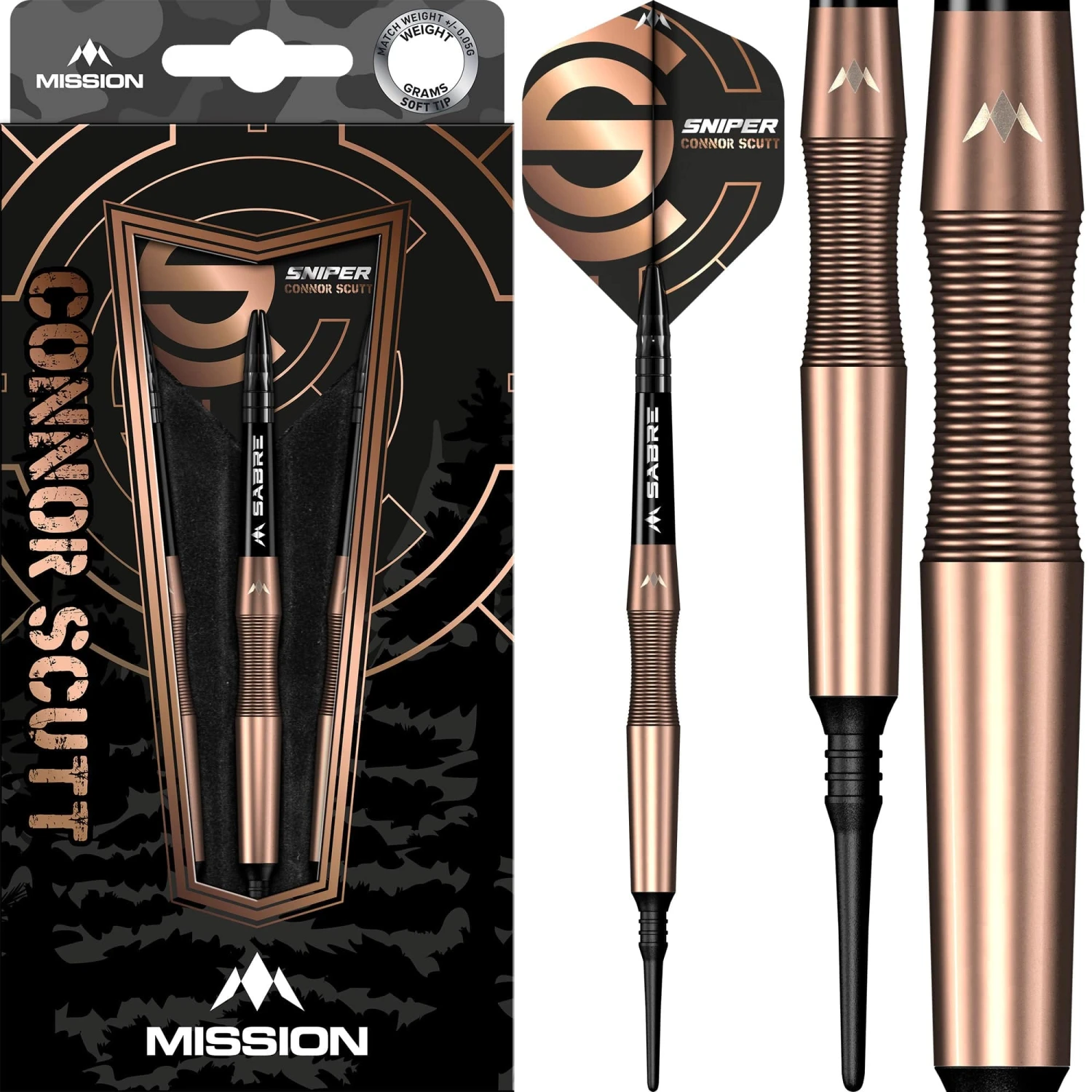 Mission Connor Scutt V2 Soft Tip Tungsten Darts – 90% Tungsten – Sniper. Features: 90% Tungsten Barrels, Silica Coating, 1 Set of Mission Flights, 1 Set of Mission Shafts.
