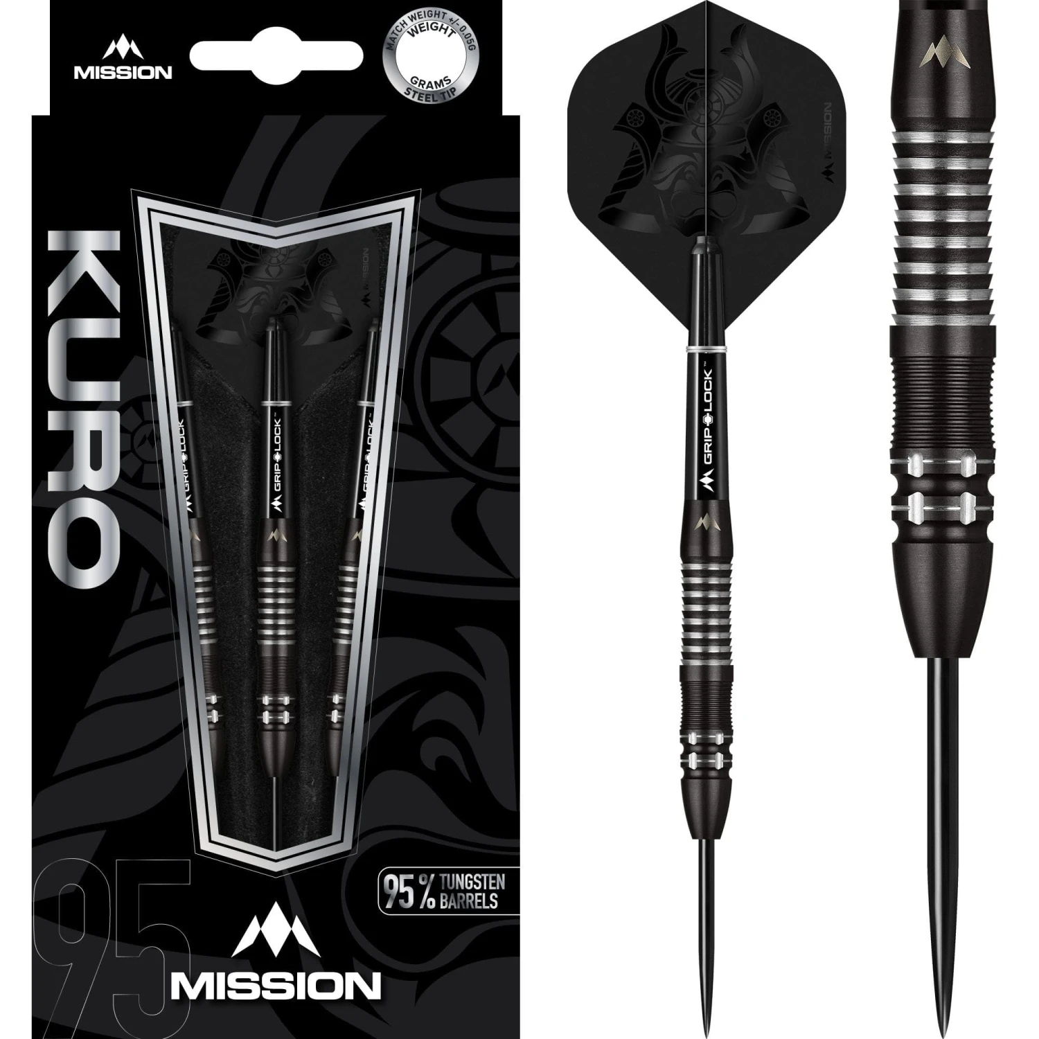 Mission Kuro Steel Tip Tungsten Darts – 95% Tungsten. Features: 95% Tungsten Barrels, 1 Set of Mission Flights, 1 Set of Mission Shafts with S-Lock rings, Point Protector. Mission Kuro Darts – Steel Tip – Black – M2 – Razor Scallop – 23g-D5393 Black Coating.