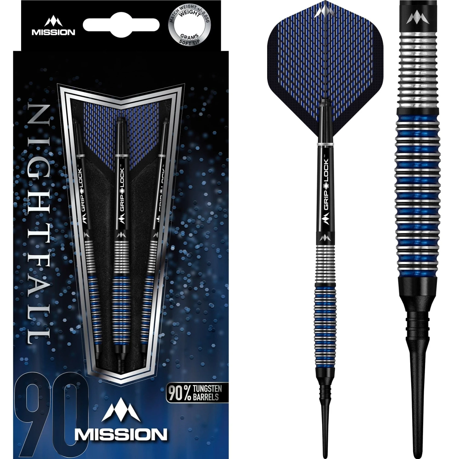 Mission Nightfall Soft Tip Tungsten Darts – 90% Tungsten. Features: 90% Tungsten Barrels with Curved, 1 Set of Mission Flights, 1 Set of Mission Shafts with S-Lock rings, Point Protector. Mission Nightfall Darts – Soft Tip – M4 – Curved – 19g-D9790 Blue