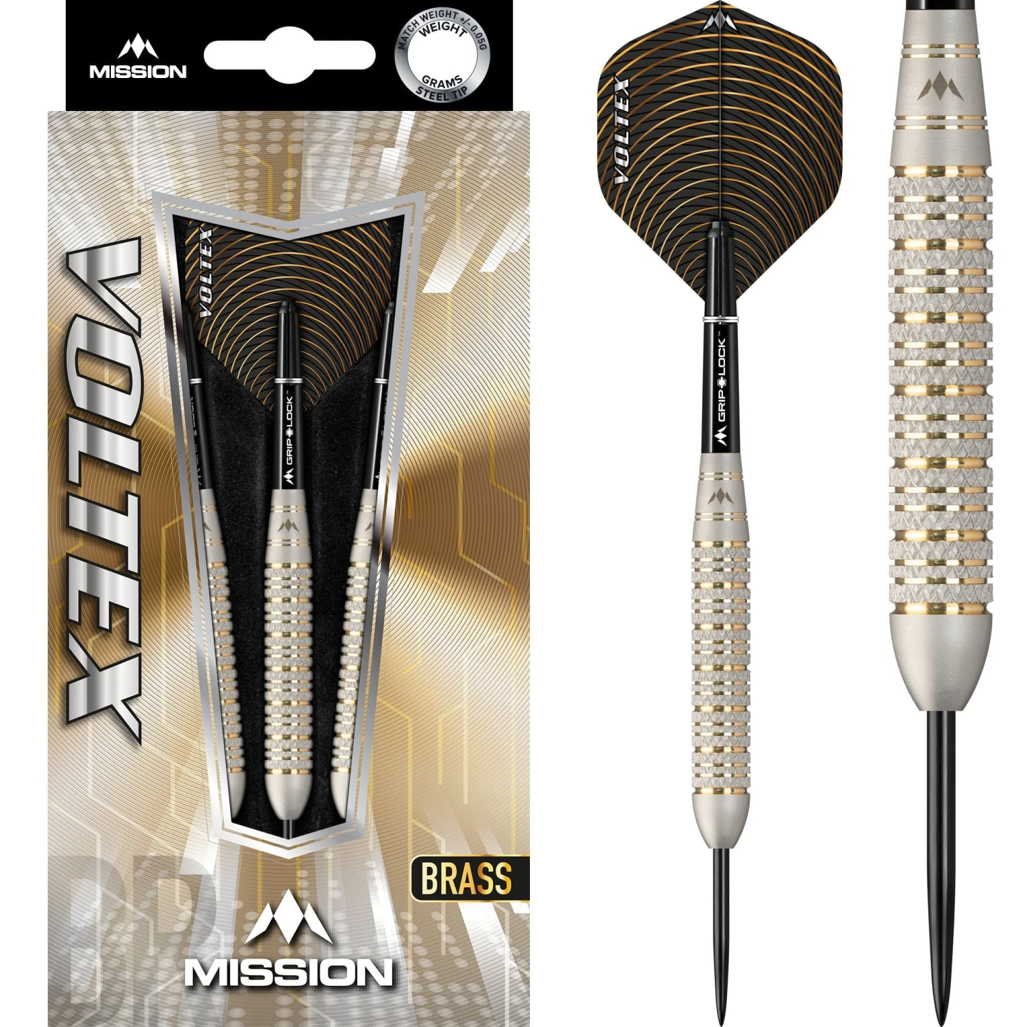 Mission Voltex Steel Tip Brass Darts – Electro Silver. Features: Electro Coated Brass Barrels, 1 Set of Mission Flights, 1 Set of Mission Shafts with S-Lock rings, Point Protector. Mission Voltex Darts – Steel Tip Brass – M2 – Silver – Knurled – 25g-D1586