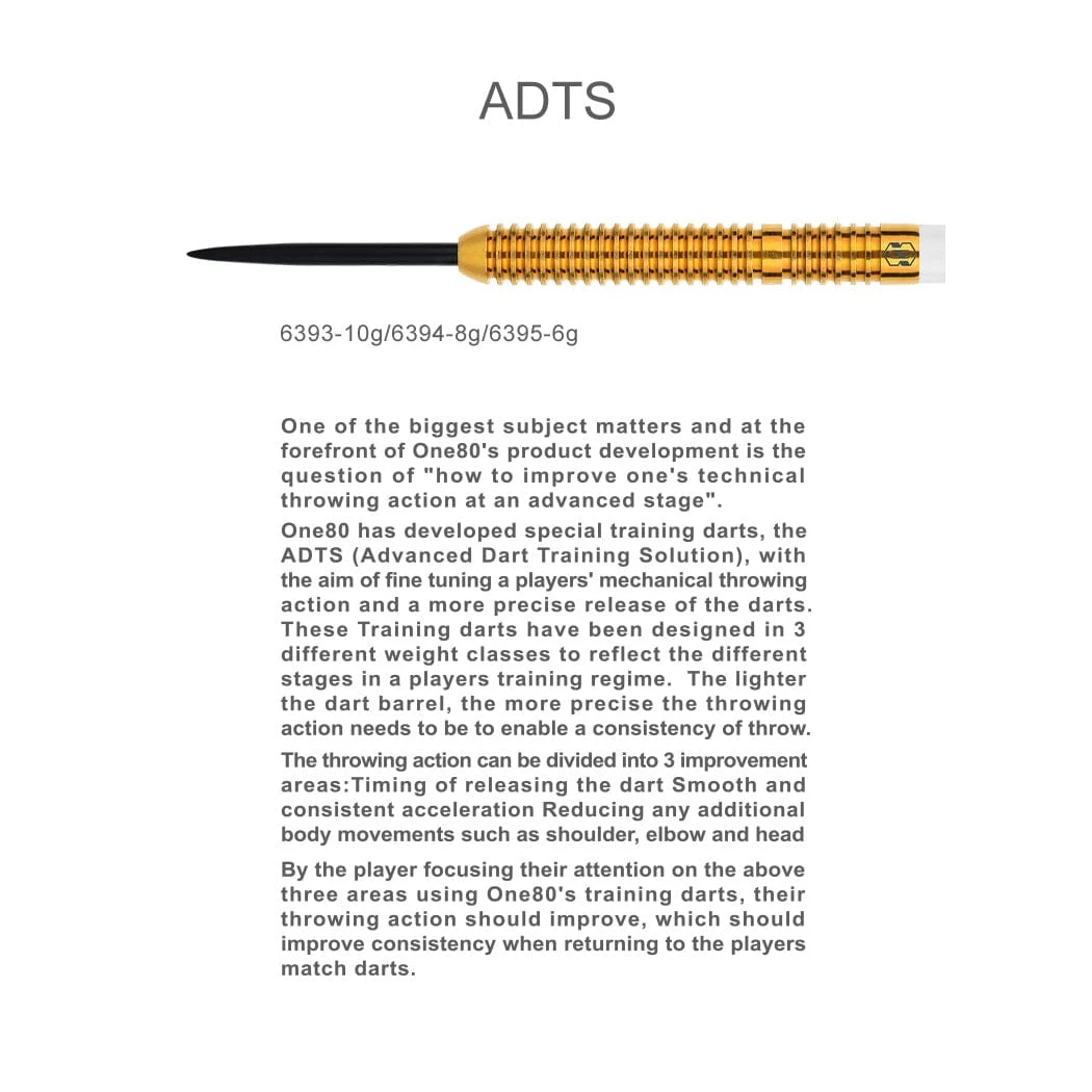 One80 ADTS Darts – Steel Tip Brass – Advanced Dart Training Solution – 6g. One80 has developed special training darts, the ADTS, with the aim of fine tuning a players’ mechanical throwing action and a more precise release of the darts. These training darts have been designed in 3 different weights to reflect the different stages in a players training regime. The lighter the dart barrel, the more precise the throwing action needs to be to enable a consistency of throw. The throwing action can be divided into 3 improvement areas: Timing of releasing the dart. Smooth and consistent acceleration. Reducing any addition body movements such as shoulder, elbow and head. By the player focusing their attention on the above 3 areas using these darts, their throwing action should improve, which should improve consistency when returning to the players match darts.
