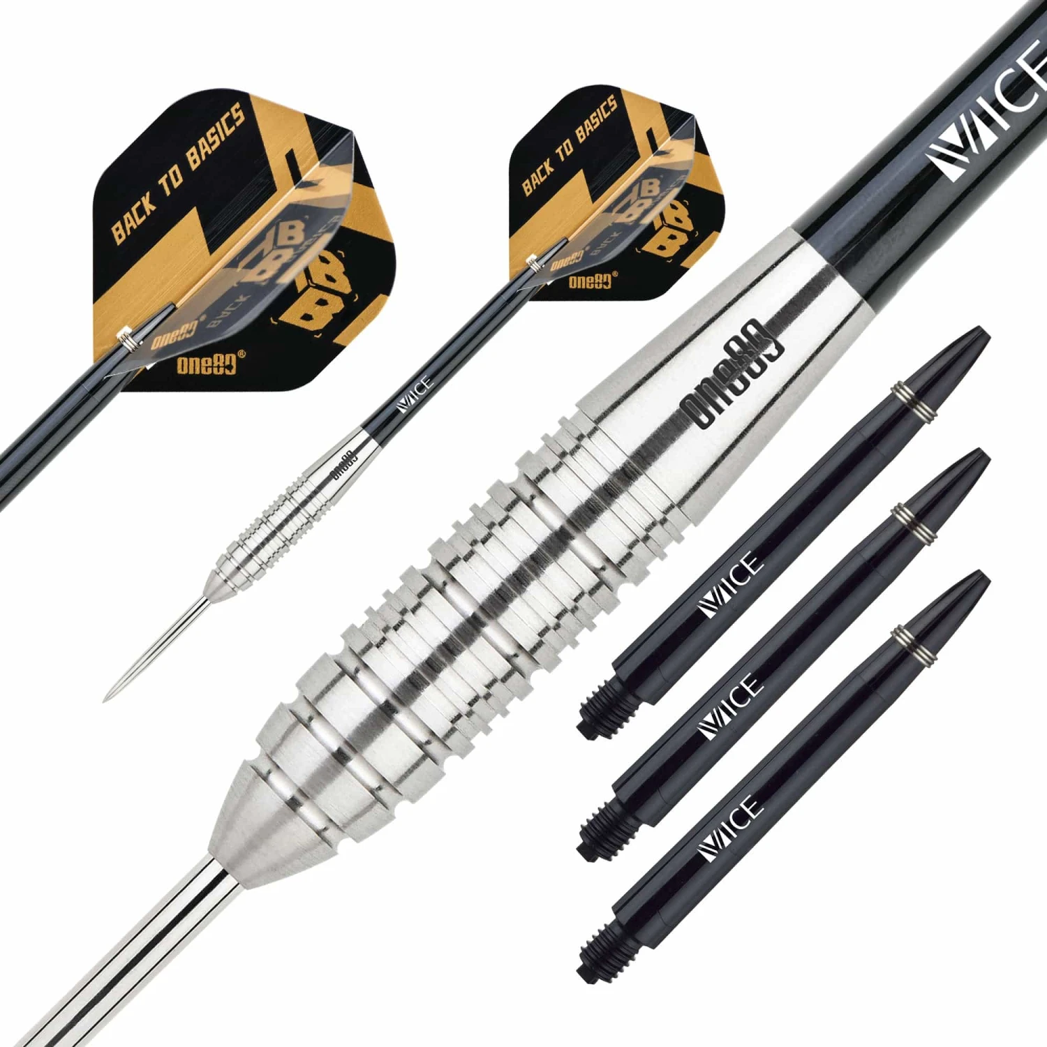 One80 Back To Basic Darts – Steel Tip – JLS – Natural – Ringed – 23g. Features: HD (High Density) Tungsten, Matched Weighted, Set of Nylon Shafts, Set of One80 Flights