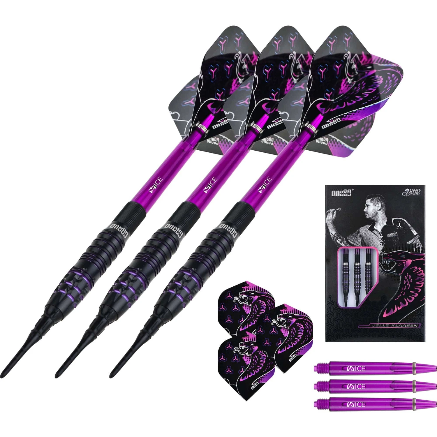 One80 Jelle Klaasen VHD Darts – Soft Tip – The Cobra – Black – 16g. These One80 Jelle Klaasen Soft Tip darts feature a black coating with coloured rings as designed by the Cobra himself. Made from VHD 90% Tungsten, these uniquely shaped barrels with a ringed, milled and microgrip design are complete with some One80 Vice Shafts and flights.