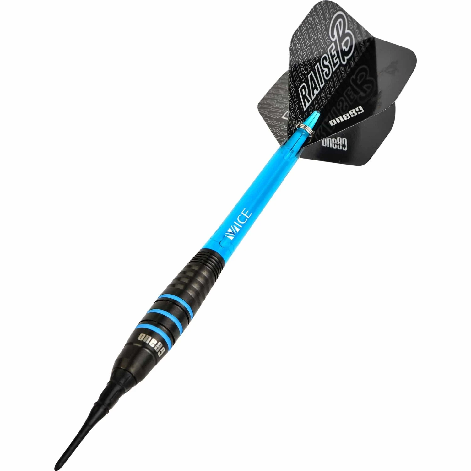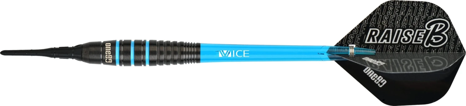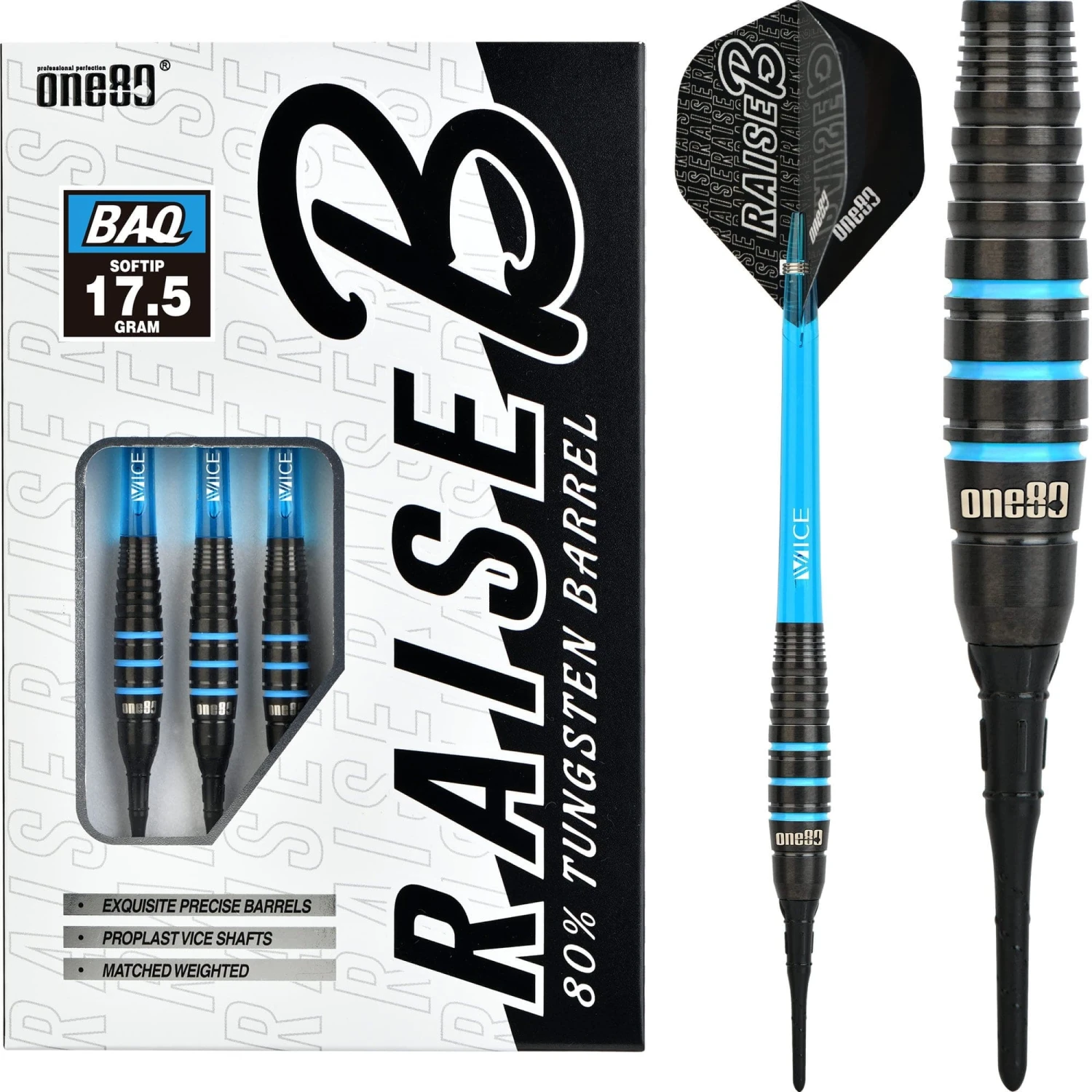 One80 Raise B Soft Tip Tungsten Darts. Features: HD (High Density) Tungsten, Matched Weighted, Set of Nylon Shafts, Set of One80 Flights One80 Raise B Darts – Soft Tip – Black – Aqua Blue Rings