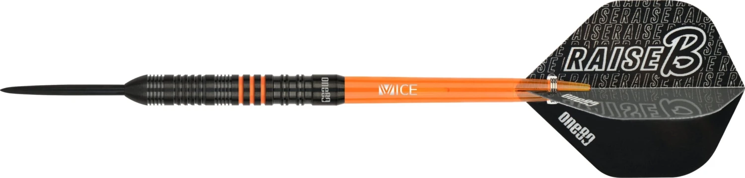 One80 Raise B Steel Tip Tungsten Darts. Features: HD (High Density) Tungsten, Matched Weighted, Set of Nylon Shafts, Set of One80 Flights One80 Raise B Darts – Steel Tip – Black – Orange Rings