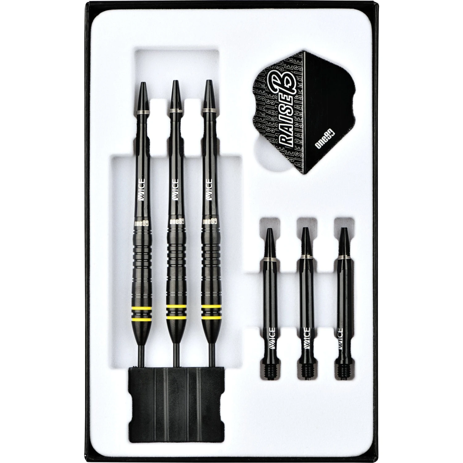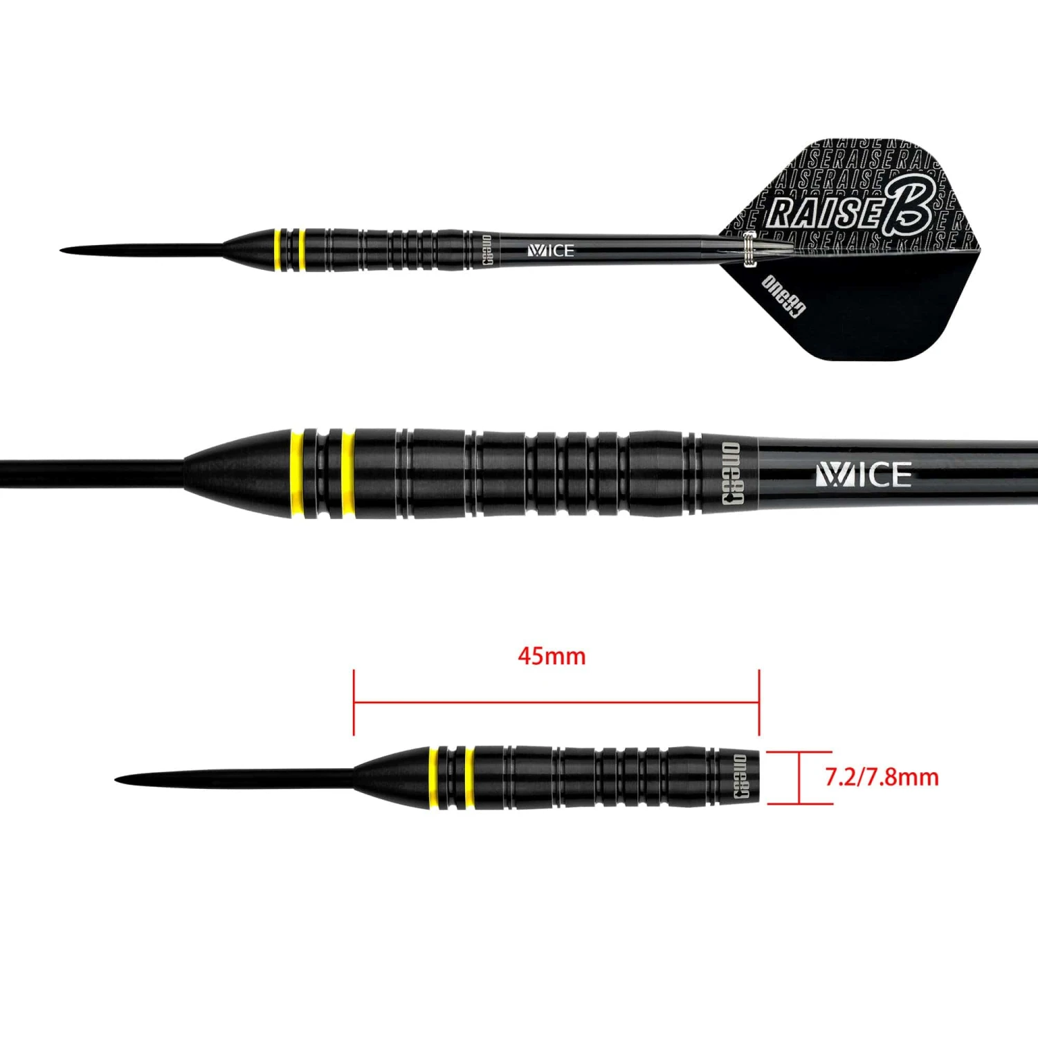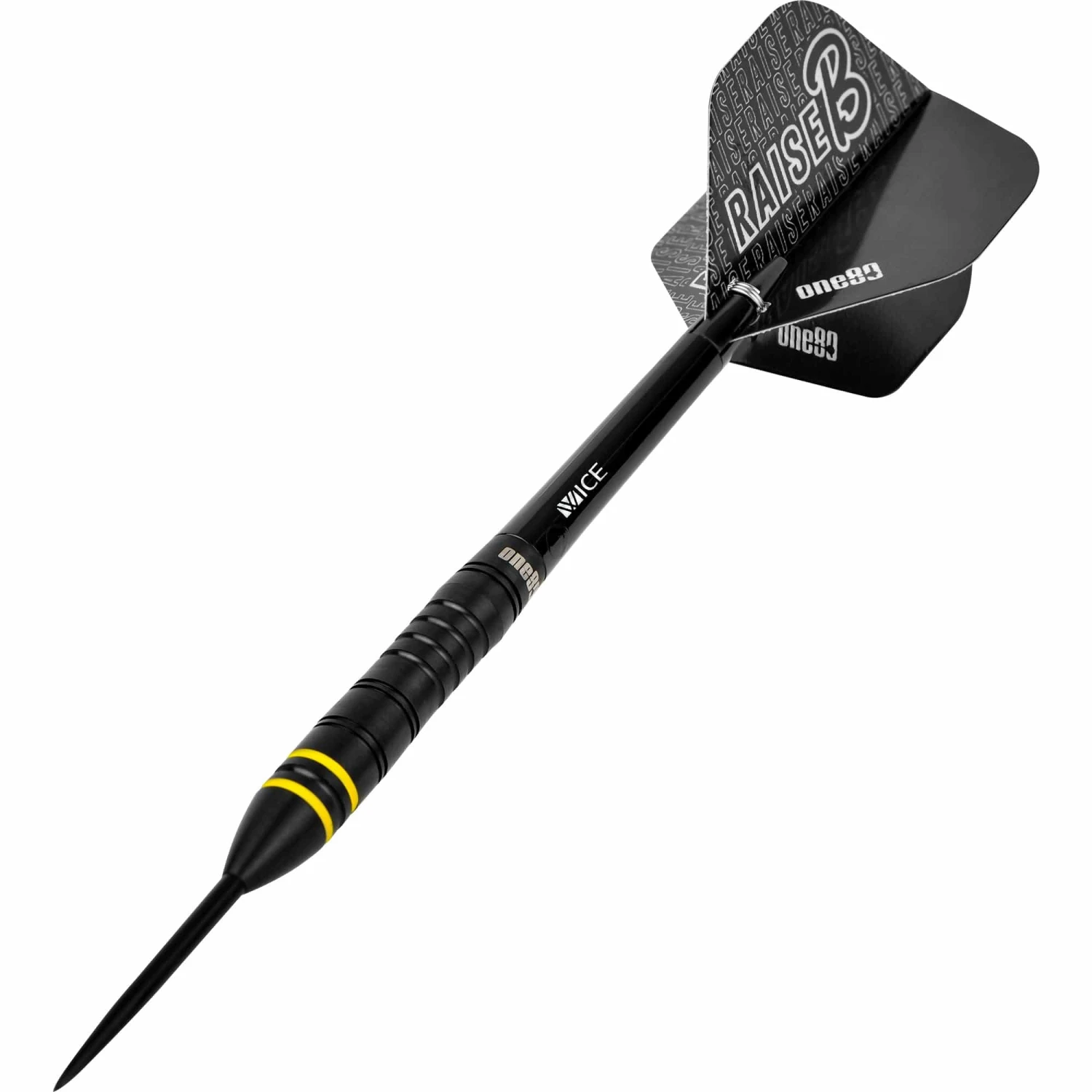 One80 Raise B Steel Tip Tungsten Darts. Features: HD (High Density) Tungsten, Matched Weighted, Set of Nylon Shafts, Set of One80 Flights One80 Raise B Darts – Steel Tip – Black – Yellow Rings