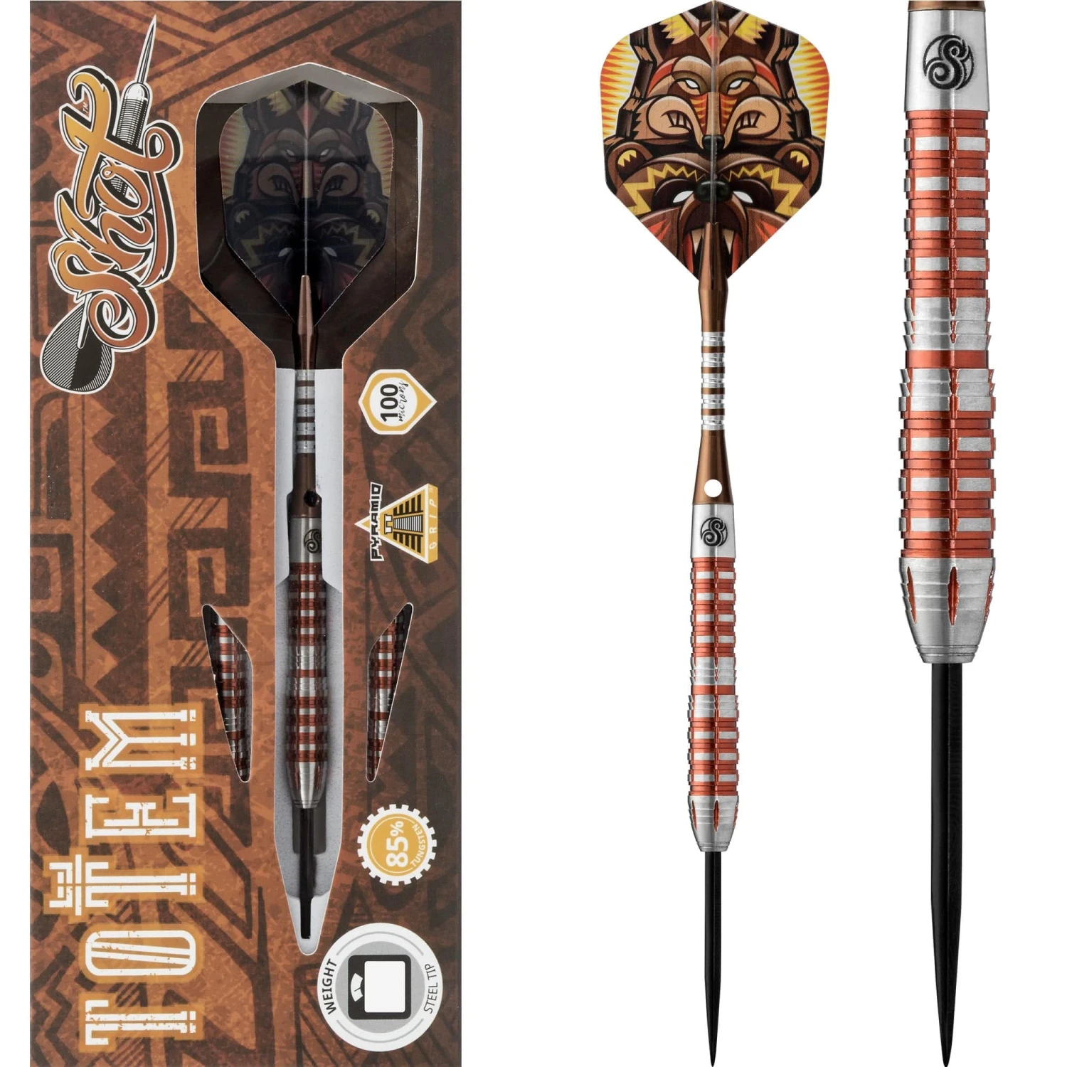 Shot Totem III – Steel Tip Tungsten Darts. Features: 85 Percent Tungsten Barrels, Shot Shafts, Shot Flights.