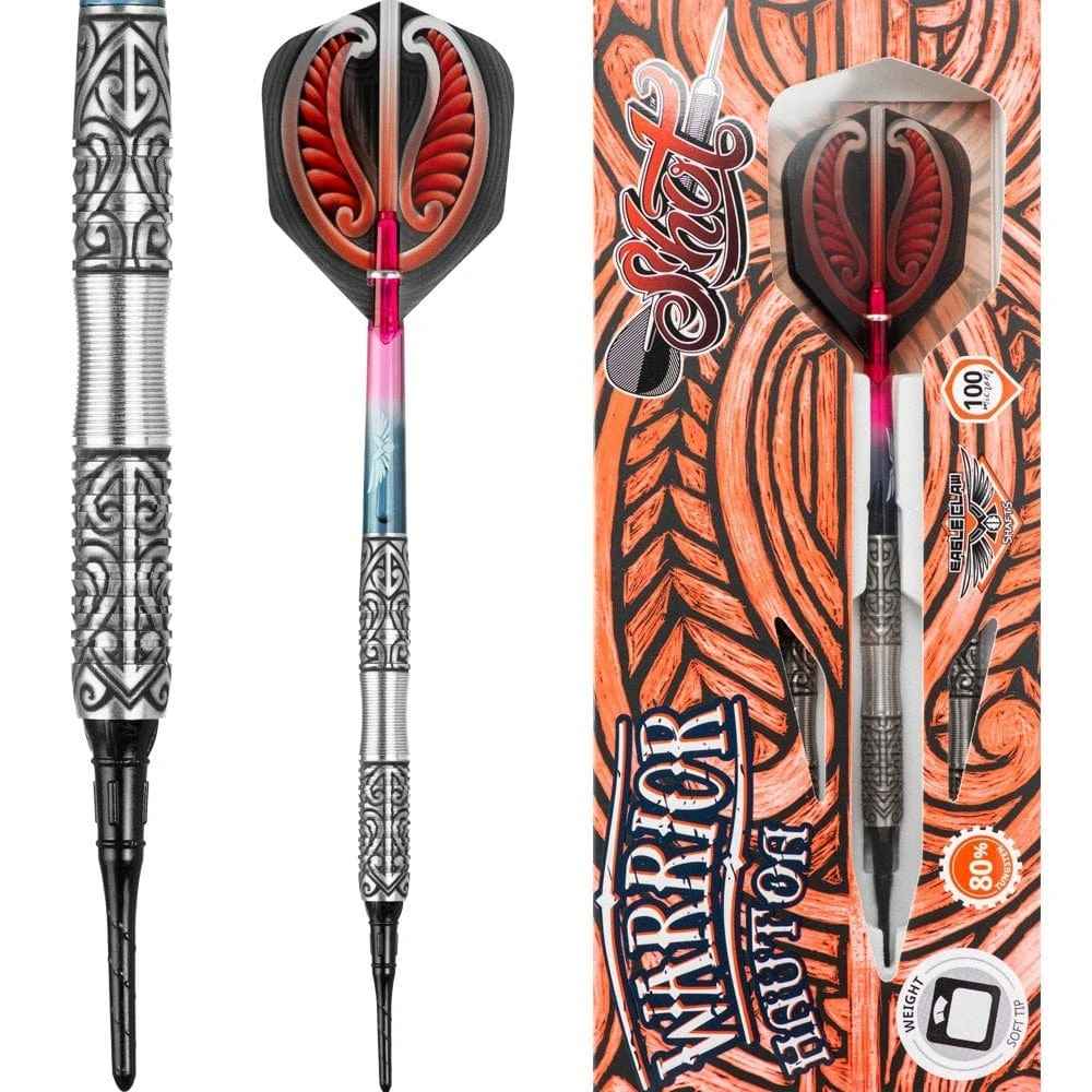 Shot Warrior Hautoa Soft Tip Tungsten Darts. Features: 80 Percent Tungsten Barrels, Shot Shafts, Shot Flights.