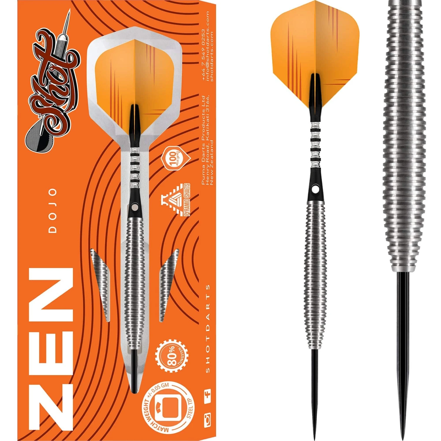 Shot Zen Series – Dojo 80% Steel Tip Tungsten Darts. Features: 80% Tungsten Barrels, Shot Flights, Shot Shafts.