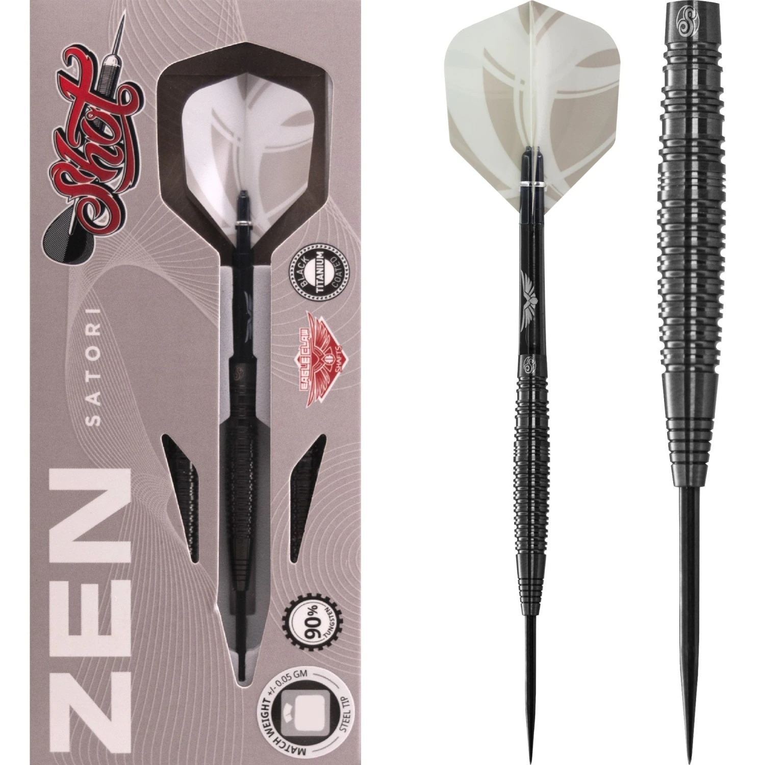 Shot Zen Satori – Steel Tip Tungsten Darts. Features: 90 Percent Tungsten Barrels, Shot Shafts, Shot Flights.