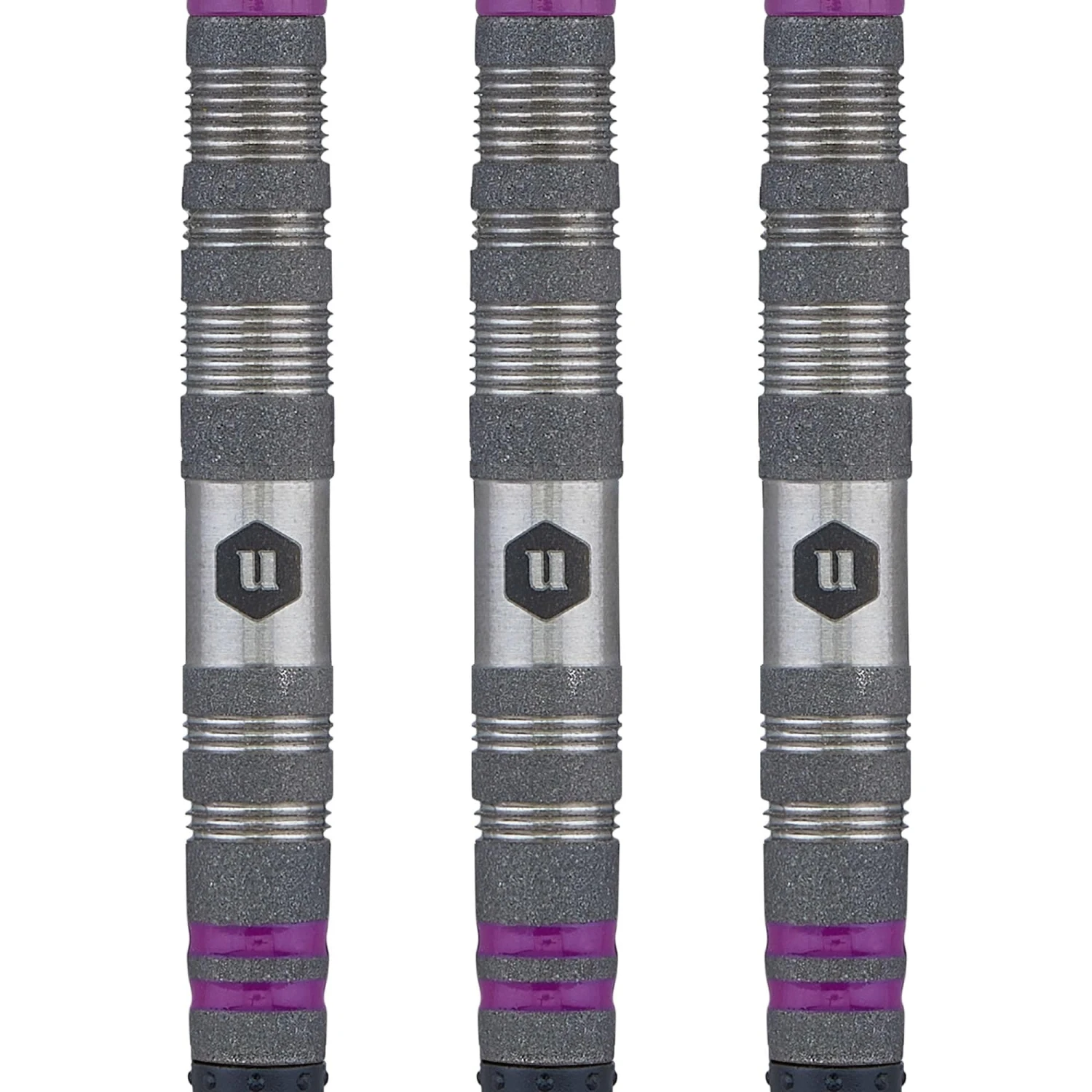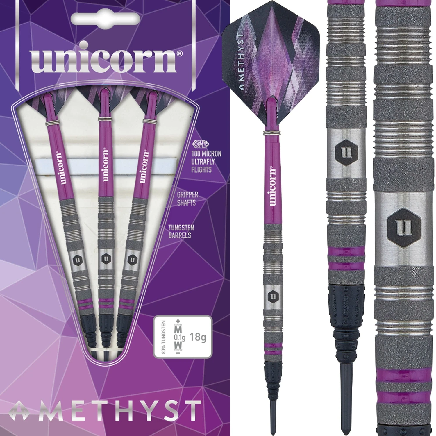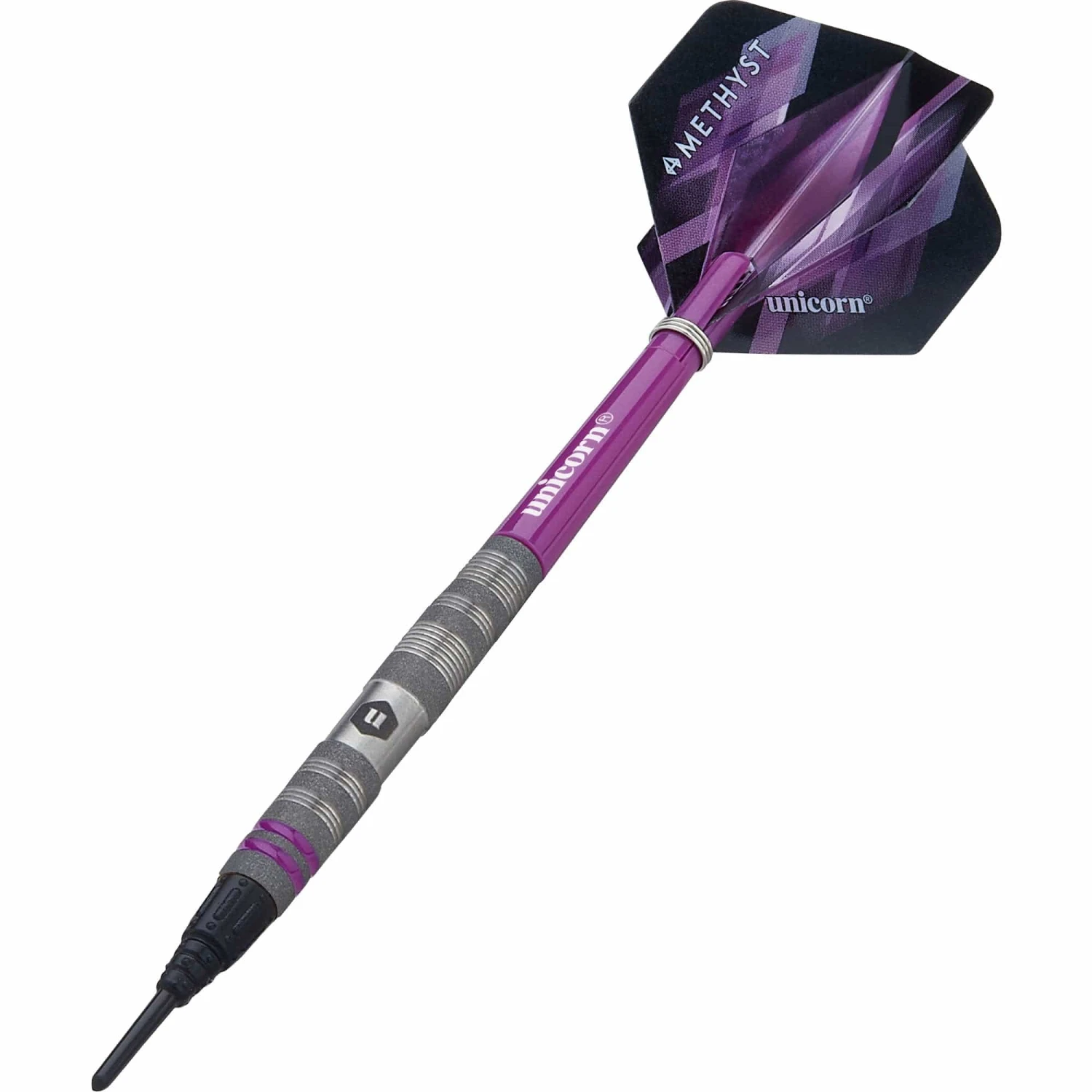 Unicorn Amethyst Darts – Soft Tip – Utech – Style 2 – Sandblasted – 18g. These 80% tungsten darts from the Utech range feature a striking tactile sandblasted finish for that extra grip. They contain a double purple ring at the front of the barrel to complete the look. Includes Ultrafly flights and Gripper shafts.