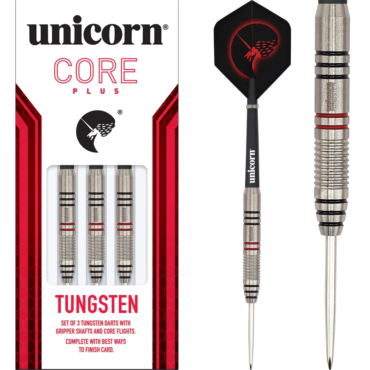 Unicorn Core Plus Steel Tip Tungsten Darts. Features: Precision Engineered Tungsten Barrels, Gripper Shafts, Engraved Unicorn Hallmark, Complete with Dart Wallet