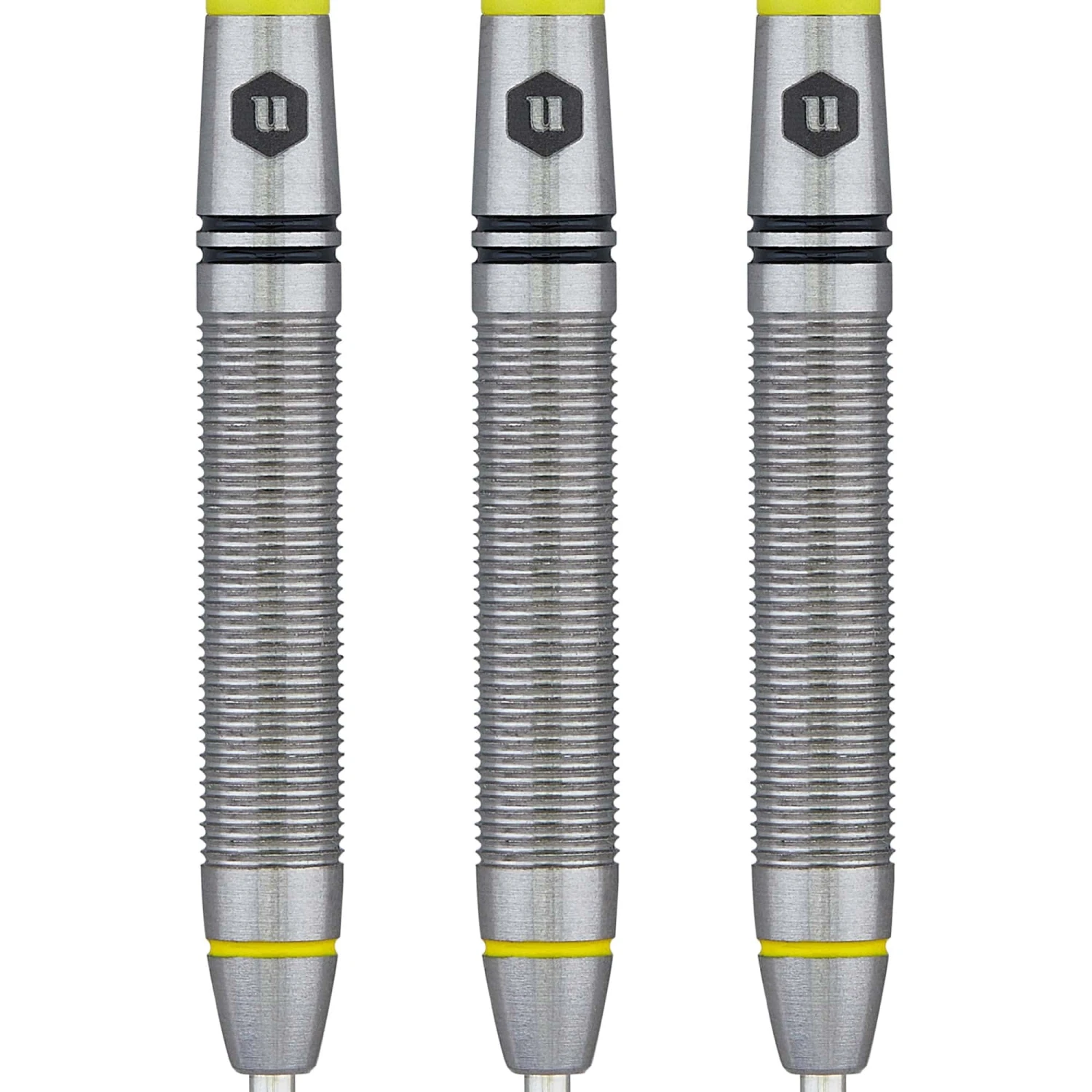 Unicorn Flair Darts – Steel Tip – Style 5 – Micro Grip – 24g. These 80% tungsten darts from the feature a range of barrel designs in the collection. Each barrel will contain a mix of black and yellow coloured rings in the barrel and contain ringed or knurled grips along the barrel design. Includes Ultrafly flights and Gripper shafts.
