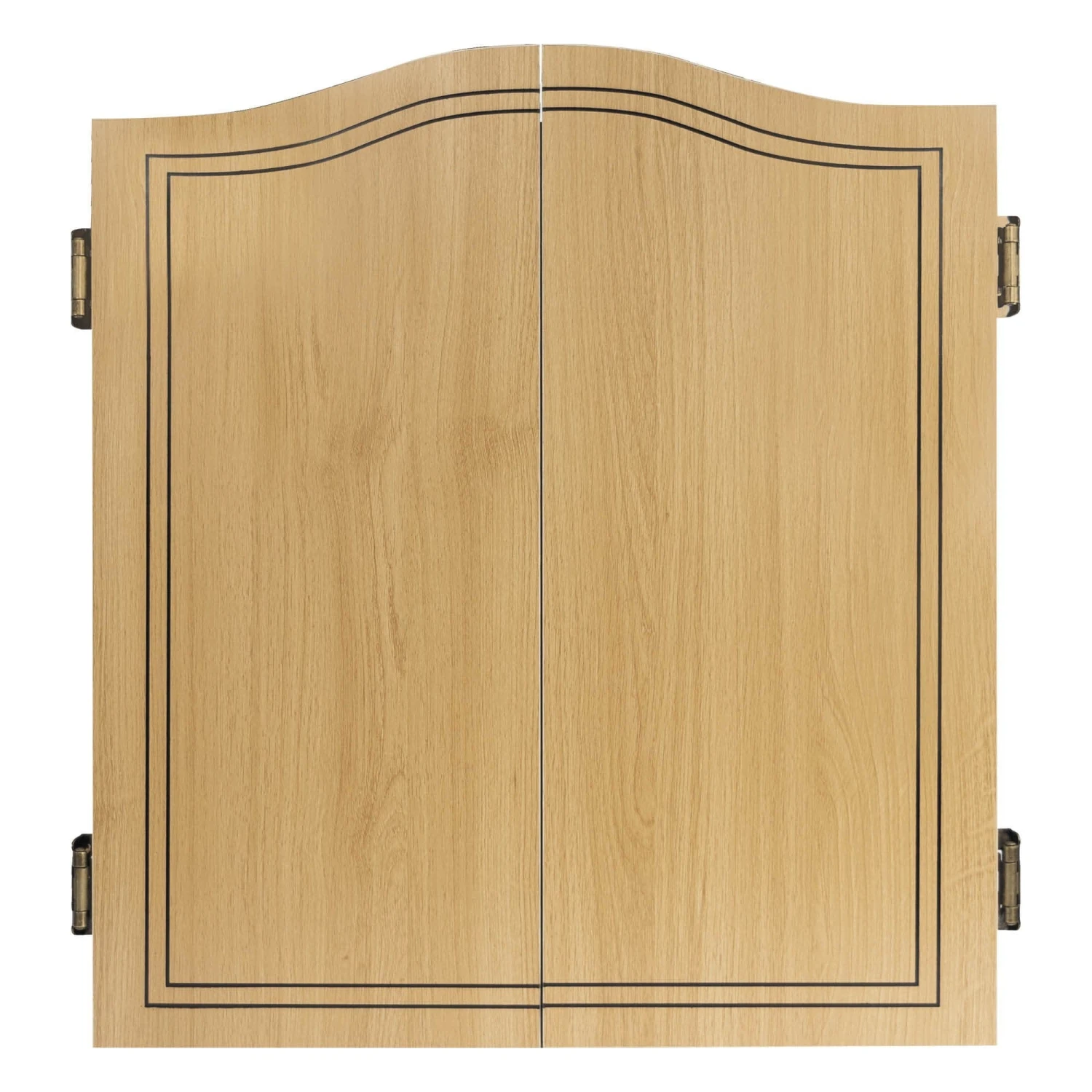 The whole kit comes inside a light Wooden Cabinet with shaped doors, so when you are not playing you can hide everything away neatly. Open the doors to reveal the wipe-clean whiteboards fixed to the insides of the doors for score keeping, and also the dartboard itself. This starter kit is completed with a FREE marker pen , a FREE board wiper, and a FREE Checkout Chart.
