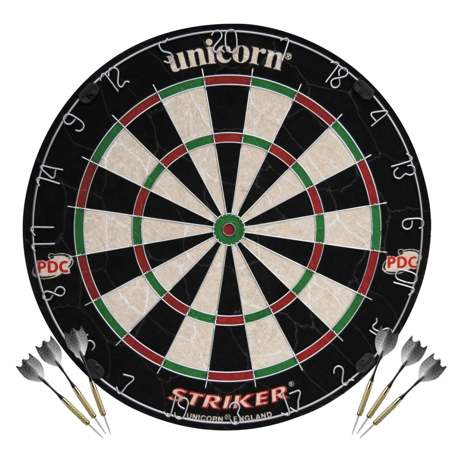 This Home Darts Centre includes a Striker Bristle dartboard with super-slim wire fasteners and a staple-free Bullseye, plus two sets of three brass darts (six darts in total).