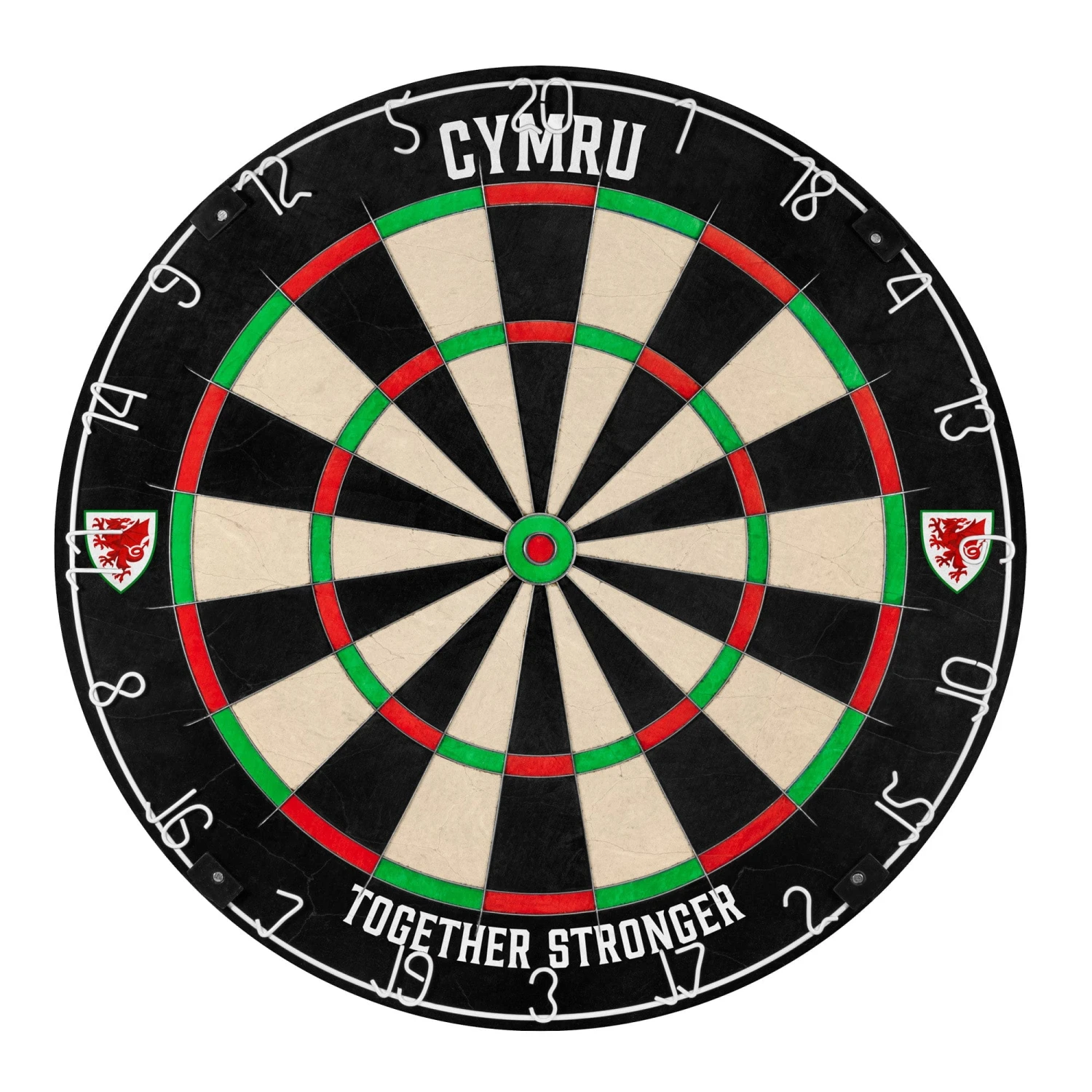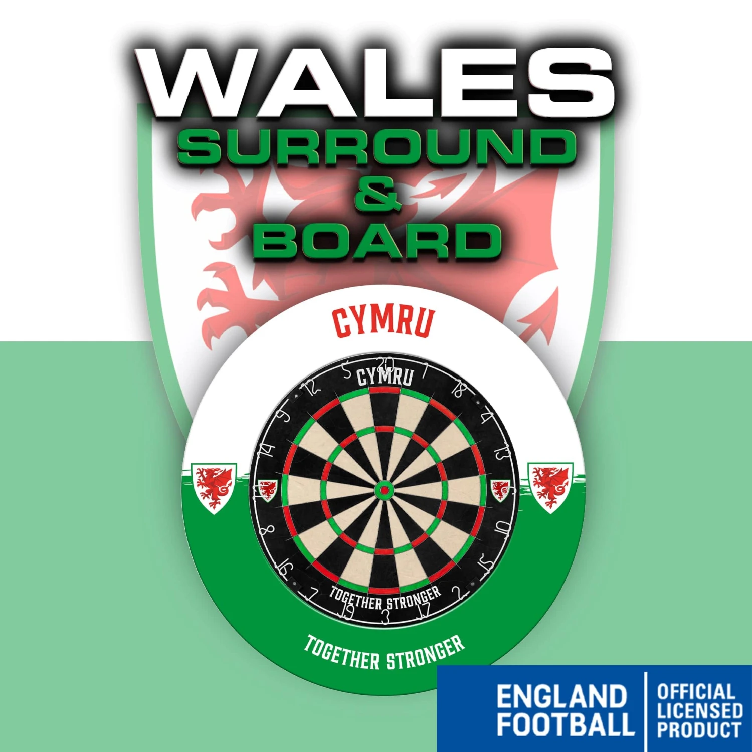An Official Wales FA Cymru Professional Dartboard and Cymru Dartboard Surround. The Professional Dartboard is a competition standard top-quality dartboard with an ultra-thin wire construction. The sharp angle of the ultra-thin wires enables darts to glance over them and into the scoring areas, resulting in less bounce outs and damage to the darts. This Wales FA dartboard is manufactured from high-quality African sisal and features a staple-free construction and vibrant non-fade colours. The Wales FA Cymru Dartboard Surround is Heavy Duty and also officially licensed. Wales FA Cymru Printed Dartboard & Printed Surround